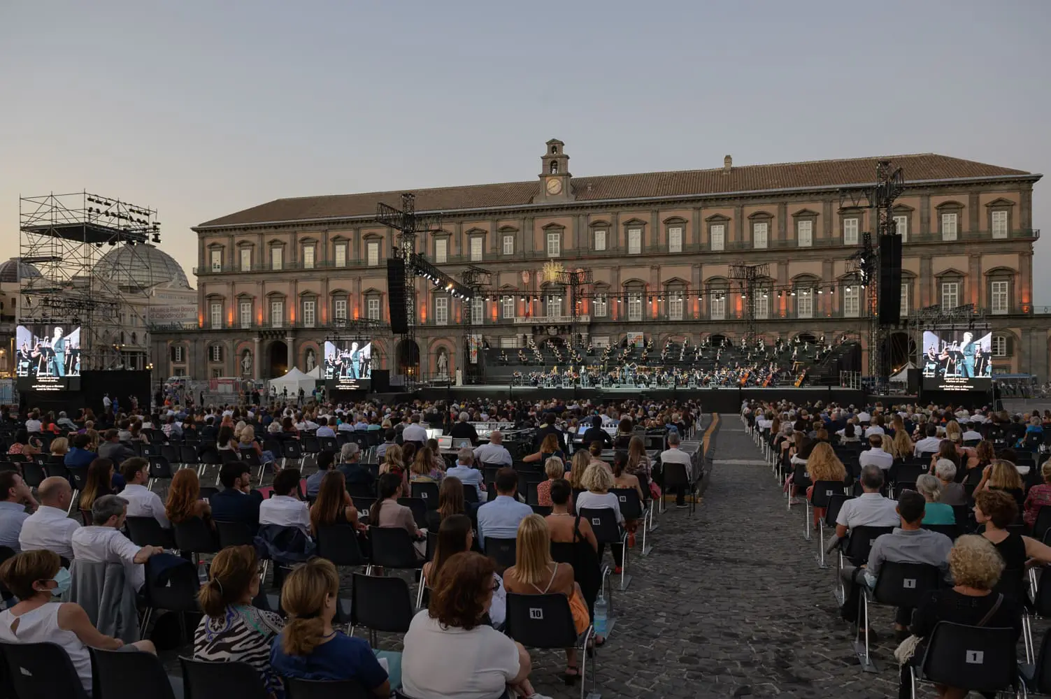 The conductor Michele Mariotti led the Orchestra and Coro del Teatro di San Carlo with sweeping contrasts and rich timbre; sadly the final most lyrical moments were marred by a chorus of firecrackers deliberately set off on the edge of the piazza to disturb the performance.