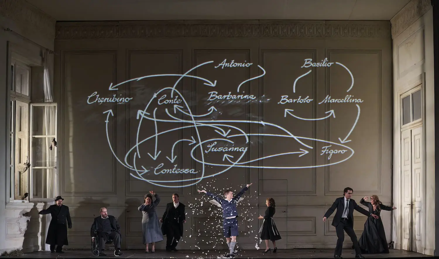 German director Claus Guth created it for the 2006 Salzburg Festival, which celebrated the 250th anniversary of Mozart’s birth by staging all 22 (complete and fragmentary) compositions for the stage. In a documentary about the production, Guth concedes his reading of Figaro is “bleak,” conjuring the psychodramas of Anton Chekhov and August Strindberg in theatre and of Ingmar Bergman in film. Guth’s approach is certainly arresting as its characters pursue ulterior motives and romantic proclivities while on the surface observing sexual and social proprieties. One striking innovation is the introduction of a mime, Cherubin as a kind of Spirit of Sexual Misrule; he’s unseen by the characters but subliminally and sometimes physically encourages them to act out their hidden desires. As this more-dangerous doppelganger for Mozart’s randy Cherubino runs amok, this Figaro summons sometimes-disquieting encounters with adultery, misogyny, physical assault, rampant teen libidos and even the great taboo of intergenerational sex (with women as both victims and perpetrators).