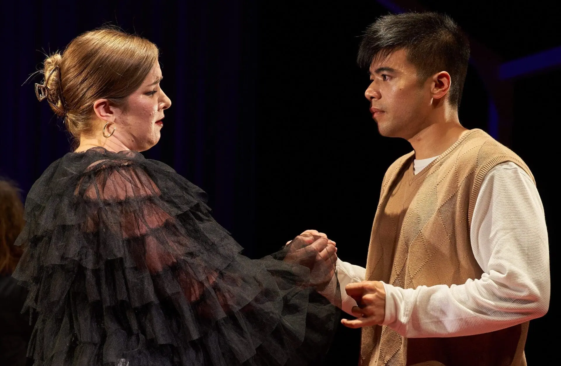 The mother and Paul, the two leads, were sung by soprano Anne-Marie MacIntosh and tenor Mishael Eusebio, both with fine voices and excellent projection of character. The secondary pair of singers, Clarence Frazer and Matthew Dalen as the caretaker and the uncle, were also highly capable singers and well able to embody the slightly sleazy aspect of their roles. The quartet chorus was comprised of well-known local singers, each of whom could have performed one of the lead roles. The tiny chamber orchestra of five, seated at center stage, played with skill and were expertly directed by Maria Fuller.