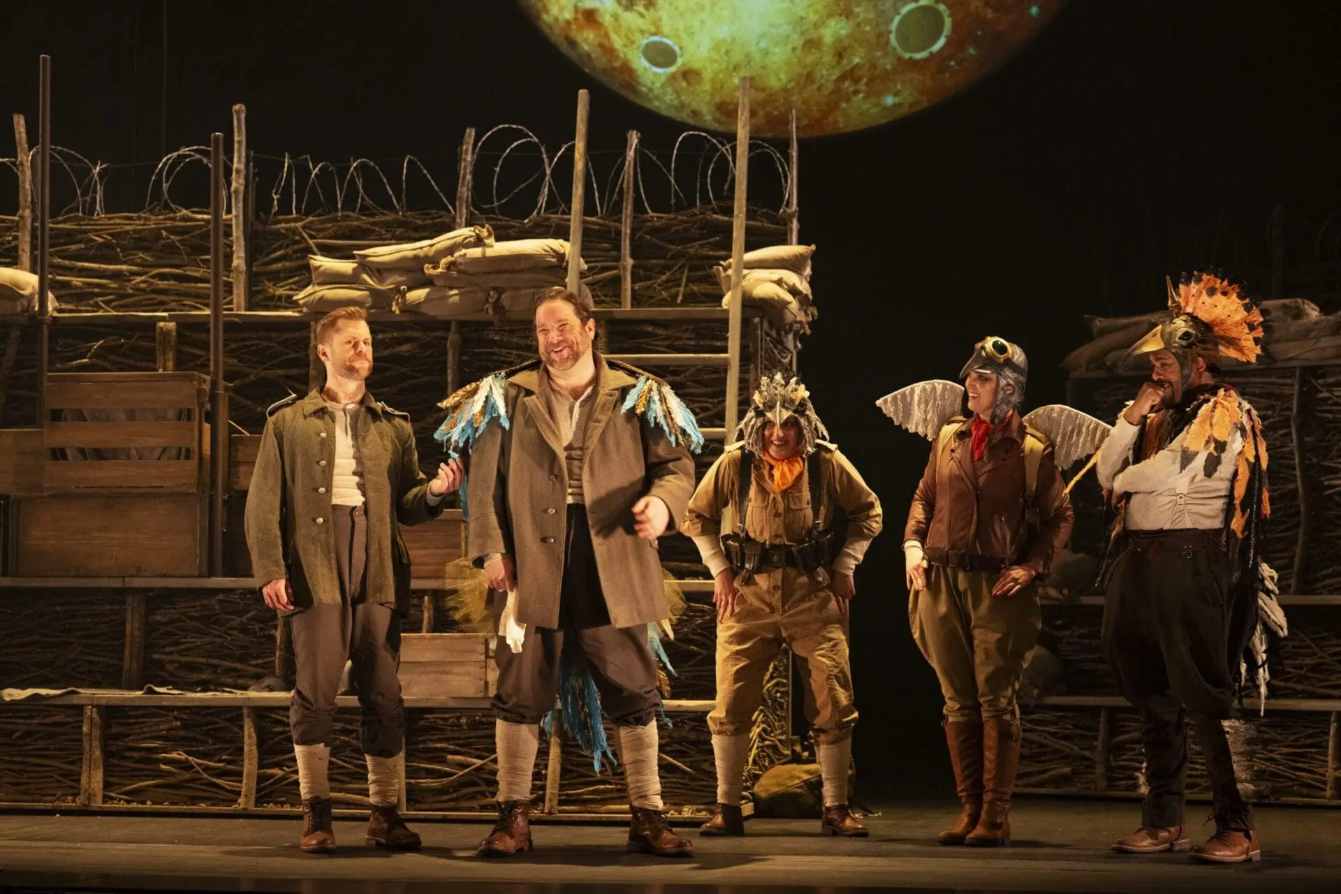 L-R, Adrian Kramer as Hoffegut, Peter Barrett as Ratefreund, Rebecca Cuddy as Drossel, Jacqueline Woodley as Zaunschüpfer and Justin Welsh Wiedhopf