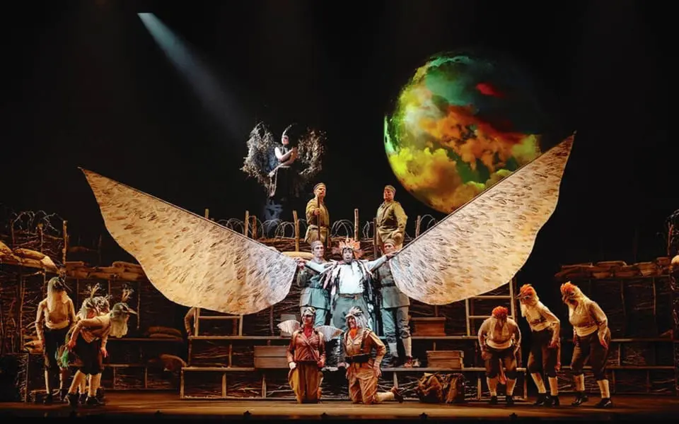 Justin Welsh, Jacqueline Woodley, Rebecca Cuddy and Claire de Sévigné with chorus members in Pacific Opera Victoria’s production of The Birds Ⓒ David Cooper