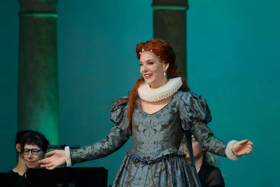 Caccini had opera in her blood. Her father, Giulio Caccini, a member of the groundbreaking Florentine Camerata, was one of the founding fathers of the genre; and in 1600 thirteen-year-old Francesca had sung in the first performance of Jacopo Peri’s Euridice, the earliest opera to survive today. By 1625, when Alcina took shape, she was highly regarded as both singer and composer, and she tailored the challenging title role to her own vocal talents. Her opera’s basic sound world will be familiar to anyone who knows Monteverdi’s three extant operatic masterworks, especially the earliest, Orfeo (1607): but in addition to the shapely recitatives and the pleasing airs, Caccini provides some particularly winning emsembles for a trio of women and a rip-roaring farewell to her enchanted isle for the defeated sorceress and her angry chorus of monsters—as so often happens in opera, the baddies get very good music to sing. And in Alcina—the captivating creature introduced in 1516 in Ariosto’s Orlando furioso, that fertile breeding ground for so many a baroque opera—Caccini fashioned for herself perhaps the most fully wrought female role yet seen in the still-youthful genre, a compelling mixture of sweet seductiveness, deep emotional vulnerability, and blinding rage. It could well have been written for Mireille Lebel, the Alcina of Boston Early Music Festival’s first-rate performance at Caramoor on the sunny late afternoon of June 25, so well did it suit her silky mezzo-soprano, with its admirable range of colors and dynamics; and her handsome, eloquent stage persona—equally convincing as glamorous enchantress and haggish witch—maintained a neat balance between period stylization and more naturalistic gestures. As the object of her obsessive affection, the Saracen knight Ruggiero (not yet a Christian convert), tenor Colin Balzer matched her in supple tone and stylistic mastery; and as the shape-shifting “good” sorceress, Melissa, Cecilia Duarte’s darker mezzo contrasted effectively with Lebel’s. As the prologue’s Neptune, bass-baritone Douglas Williams welcomed the Polish river Vistula (tenor Kyle Stegall) to the Florentine court with the requisite authority; and another BEMF stalwart, soprano Teresa Wakim, as a siren, lulled Ruggiero to slumber with beguiling grace. The opera was simply staged by Gilbert Blin, with no set but fine period costumes by Anna Watkins. Melinda Sullivan’s simple choreography was gracefully executed by the singers, who in the final ballo danced to music by Emilio de’ Cavalieri, Caccini’s score for the divertissement being lost. (Needless to say, there were no horses, though they would have made a fine sight on Caramoor’s lush and lovely grounds.) The twelve instumentalists, stationed onstage behind the action, were led from their ranks with predictable expertise by BEMF’s joint Music Directors, Paul O’Dette and Stephen Stubbs, and concertmaster Robert Mealy. Caramoor’s covered outdoor Venetian Theater may not have been the ideal venue for this Florentine entertainment, but the happy cheering at its end offered a fair signal that few in the audience felt even slightly shortchanged.
