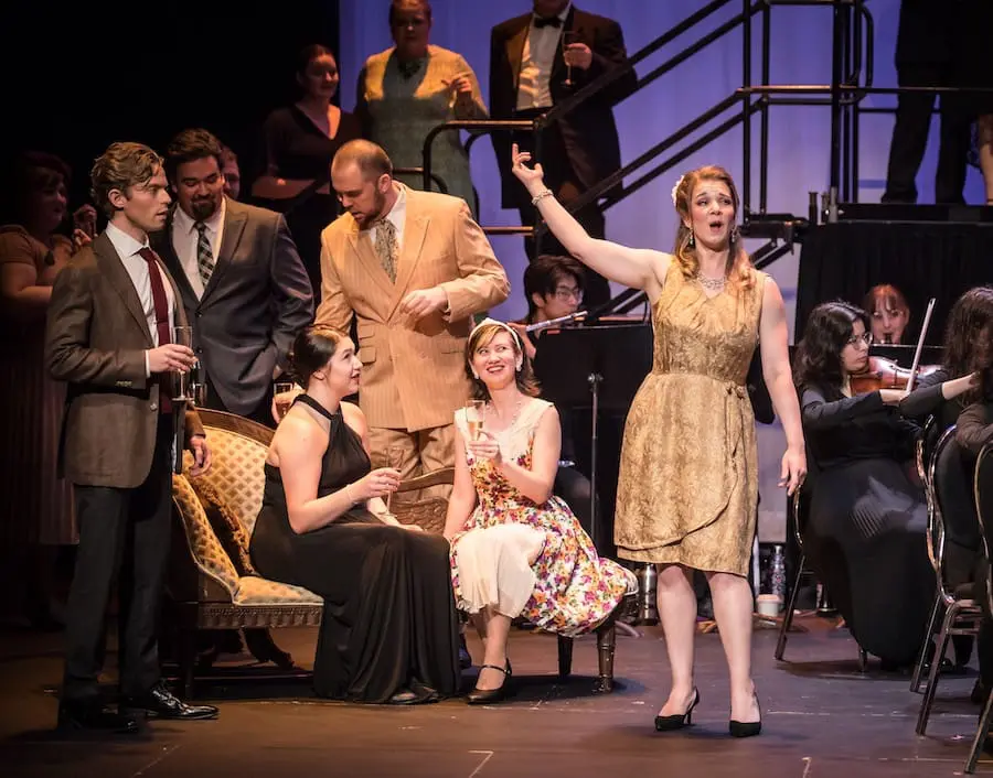 On July 13 and 14, Brott Opera presented La traviata in the 470 seat Peller Hall at Ancaster Memorial Arts Centre. Director of Development for Brott music, Jacqui Templeton Muir, mentioned in her opening remarks that it was the Peller Hall’s “baptism by opera”, the first opera performed in this acoustically friendly space. And what a christening it was.