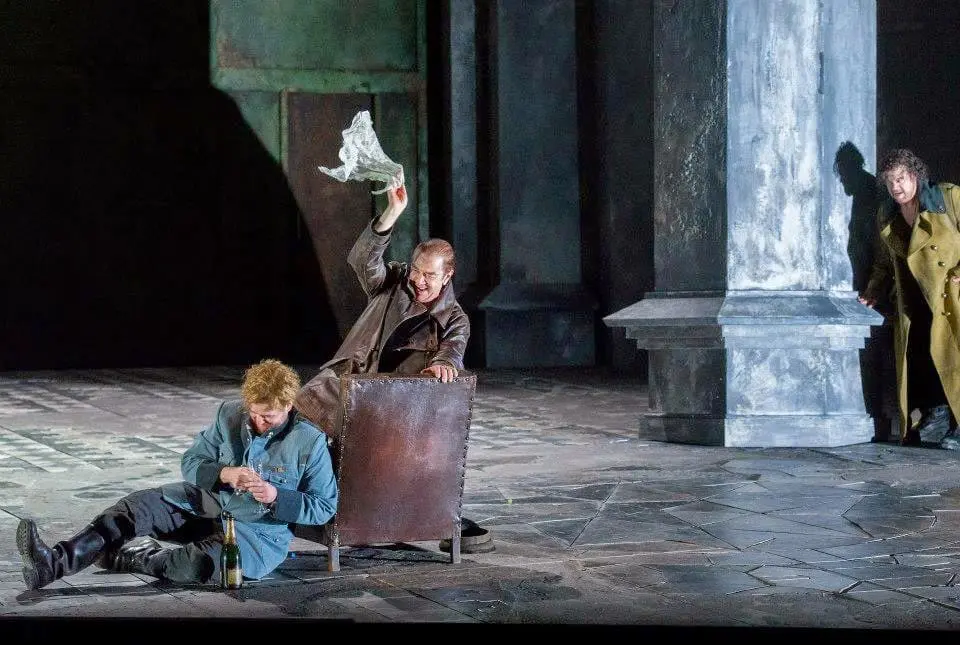 Allan Clayton (Cassio), Jonathan Summers (Iago) and Stuart Skelton (Otello) in David Alden’s 2013 ENO staging of Verdi’s Otello. Photo: Alastair Muir