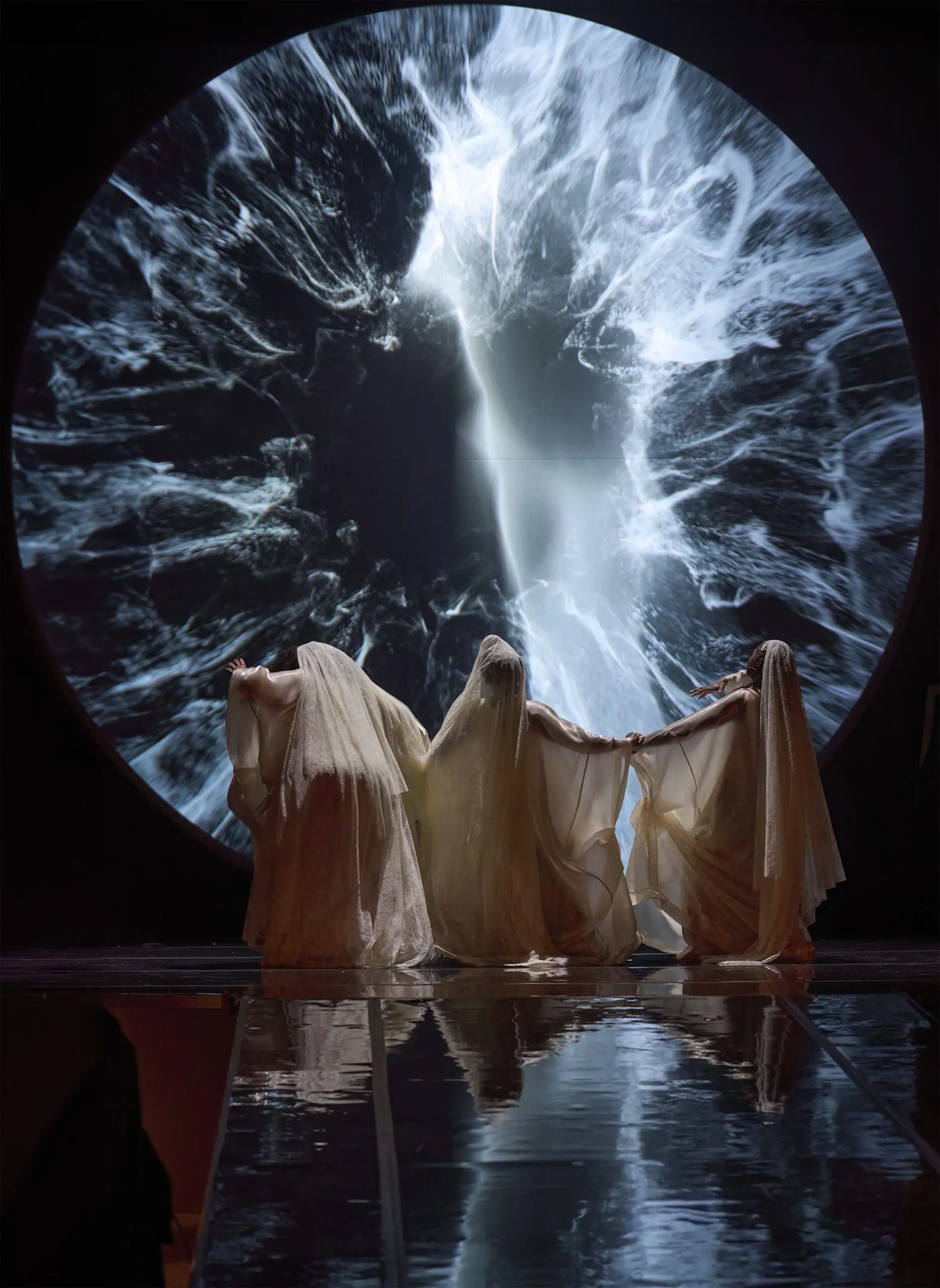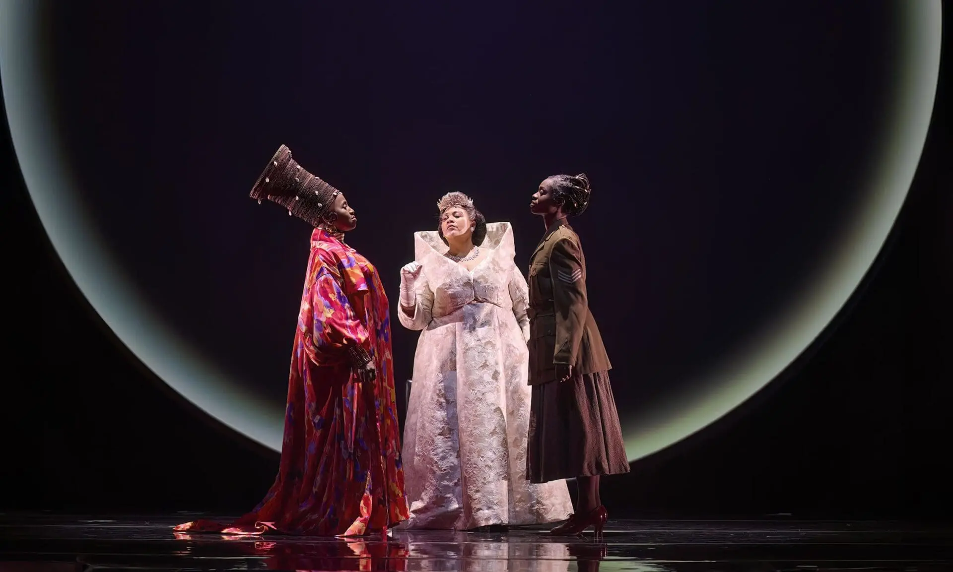 The score is at its most affecting in three modes: first, the three Portias singing together, sometimes weaving sinuously liberated contrapuntal lines around each other, settling into an instinctive equilibrium and at other times rhythmically aligned, hymn-like; second, in the eruptions of raw orchestral power, particularly when the rich percussion section is set loose; and third, in passages of lush, almost neo-Romantic lyricism, often accompanying arrangements of spirituals. Here, the latter function rather like arias, stepping out from moments of the “action” – dialogue, acting out of scenes in Portia’s life – for a period of repose and reflection. Spirituality and faith are elastic concepts throughout, urging towards the philosophical—the stage space is, in Warren’s design, intended to represent the bardo, the state of existence between death and rebirth in Buddhism.