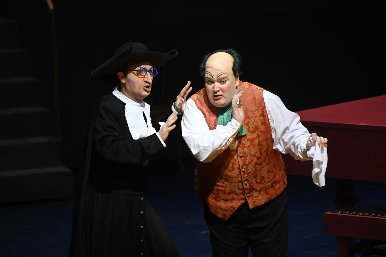 Basilio (Stephen Hegedus) teaches Bartolo (Nick Murphy) of the power of “La calunnia”