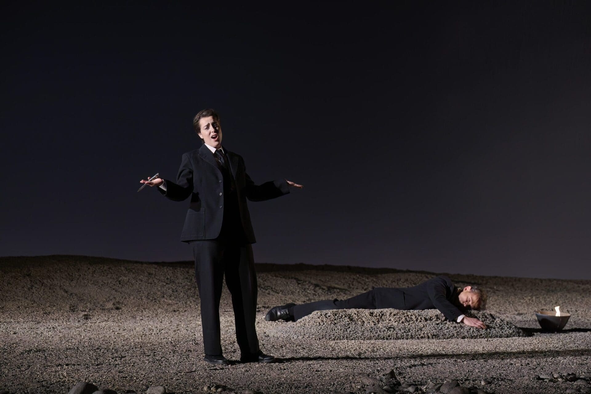 In the absence of Carsen, Christophe Gayral, part of the creative team back in 2011, served as revival director. The essentially bare stage, the monochromatic colour scheme, the opening funeral procession, the highly effective lighting with emphasis on shadowy outlines, and the unobtrusive costuming all contributed to the powerful storytelling.
