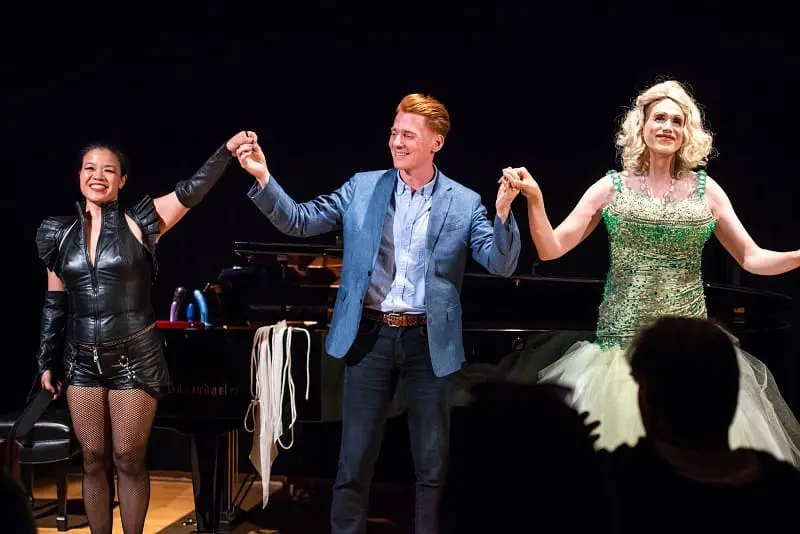 Left to right: Pianist Karen-Lee Morlang (the Morekeys de Sade), composer Isaiah Bell, & Joel Klein (Maria Toilette) in Tapestry Opera’s Cocktales with Maria—Photo: Dahlia Katz