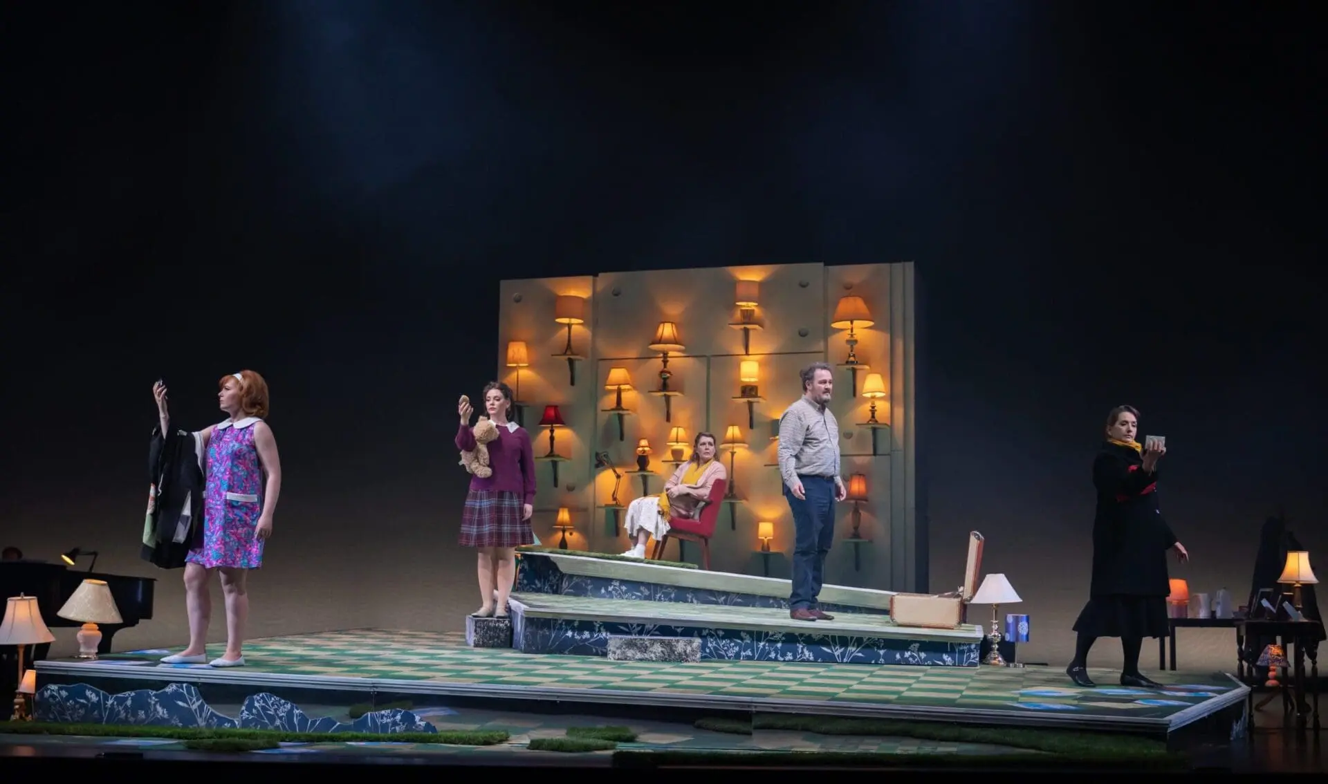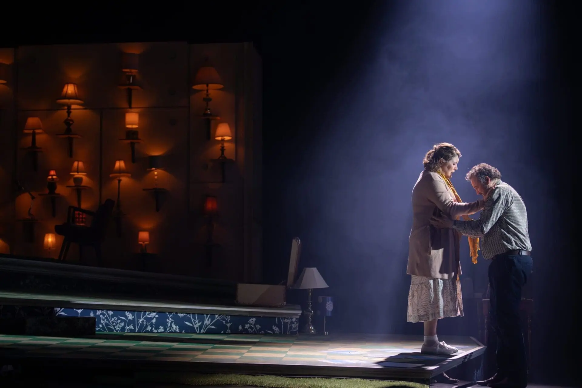 Set and costume designer Adrian Linford put the couple in a slightly off-kilter, barely decorated living space with one low-budget easy chair and a back wall covered in shaded lamps. Assorted table and floor lamps also covered a couple of spots to the left and right of the main playing space. These lamps, depending on whether the mood of the story had gone dark or had brightened with moments of Judith’s lucidity, would illuminate or dim. The symbol of light and darkness are central to the original flow of the original libretto, only there it is both symbolic and literal. Visually, without knowing what the lamps symbolized, their placement was somewhat perplexing, until director Daisy Evans explained them in an after-show panel discussion.