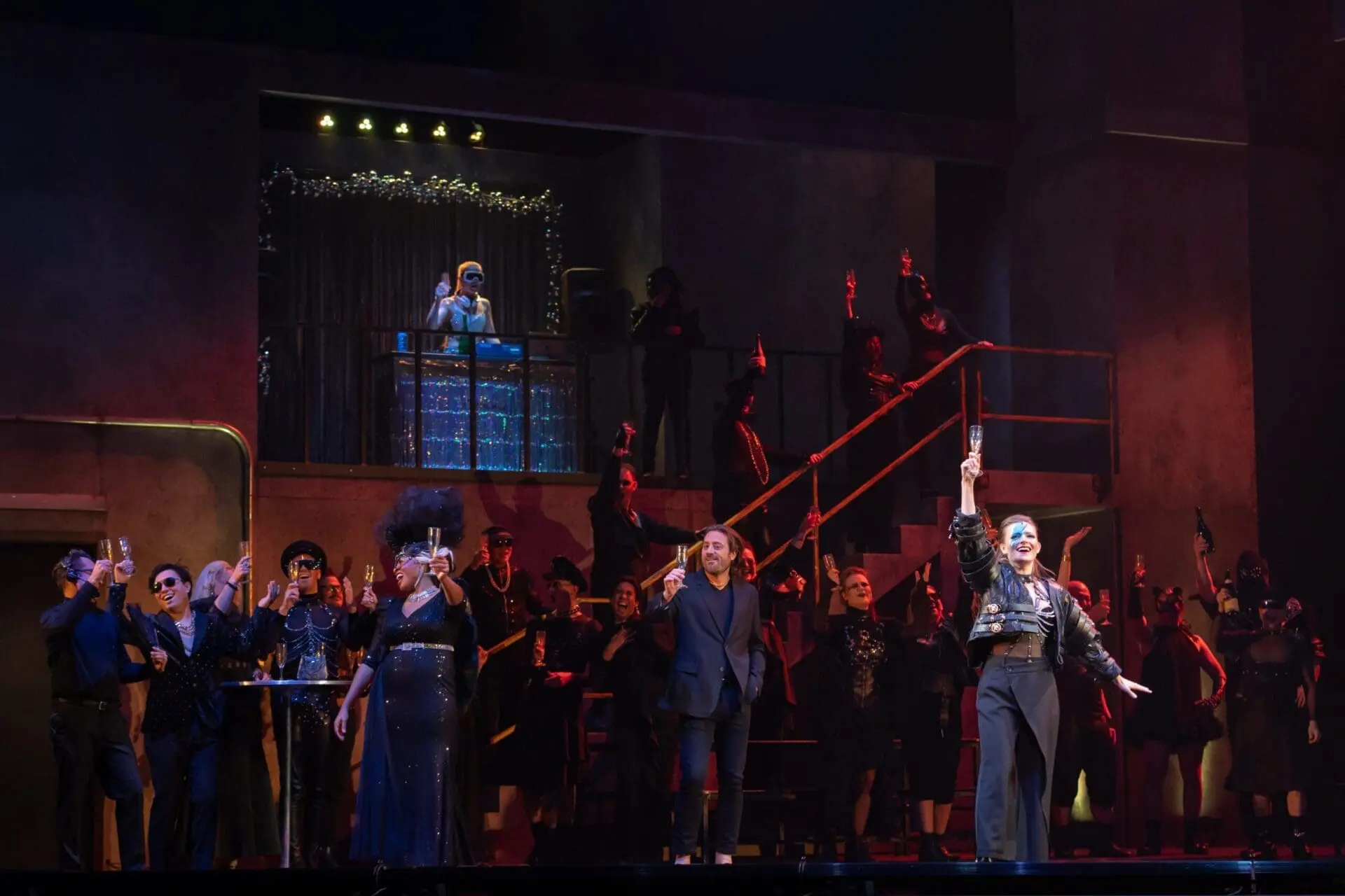 This Die Fledermaus begins not in Eisenstein’s home, where the original is set, but in a convincing-looking warehouse, designed by Patrick Du Wors, where a group of opera singers are doing a table reading of the original operetta, preparing for an imminent semi-staged production of the actual work. Here, we are introduced to the performers who will sing the parts of Eisenstein, Rosalinde, Adele, Alfred, Falke and the others.