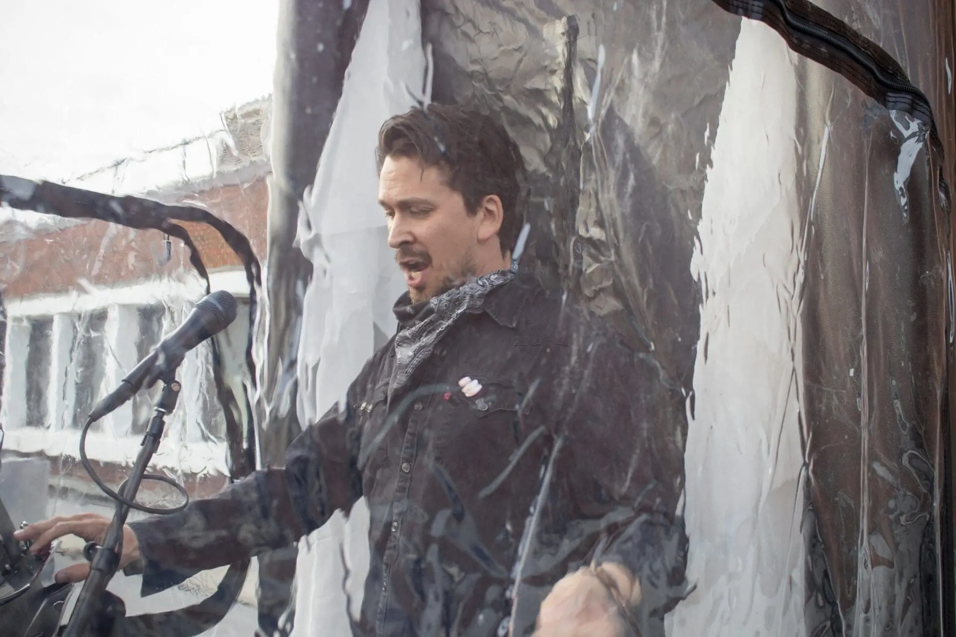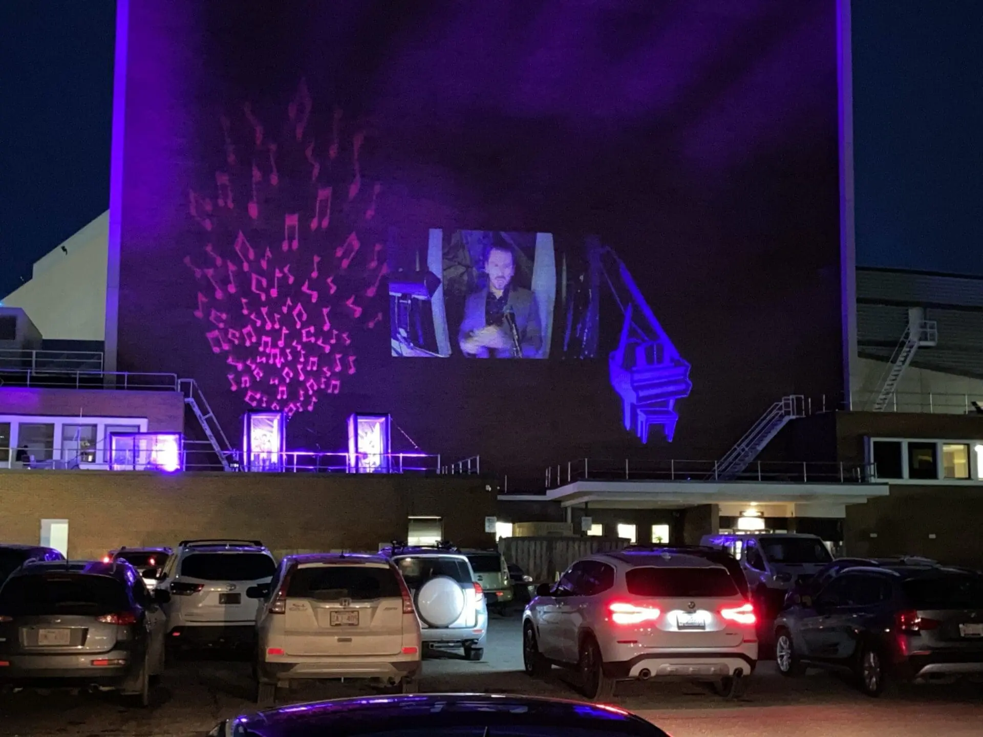 The two singers stood in separate transparent plexiglass booths on the mid-level roof of the building, in front of microphones located about 50 metres from my stall in the second row. The singers’ images were projected onto the brick wall to their left, which was also decorated with clusters of tied eighth notes. By the seven o’clock start, the sky was already dark enough to frame the images effectively, and through the ancient medium of FM radio (as opposed to the internet), the audience in their vehicles listened to the performance, each group safely ensconced in their respective metal bubbles.