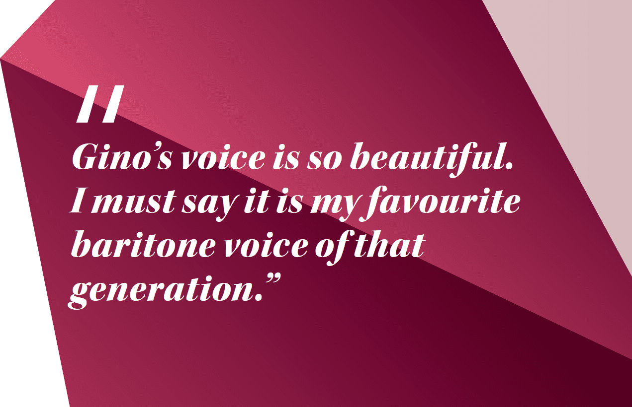 In his prime, Gino was a lyric baritone with high notes, as he puts it, and so the writings of Mozart and Rossini were best