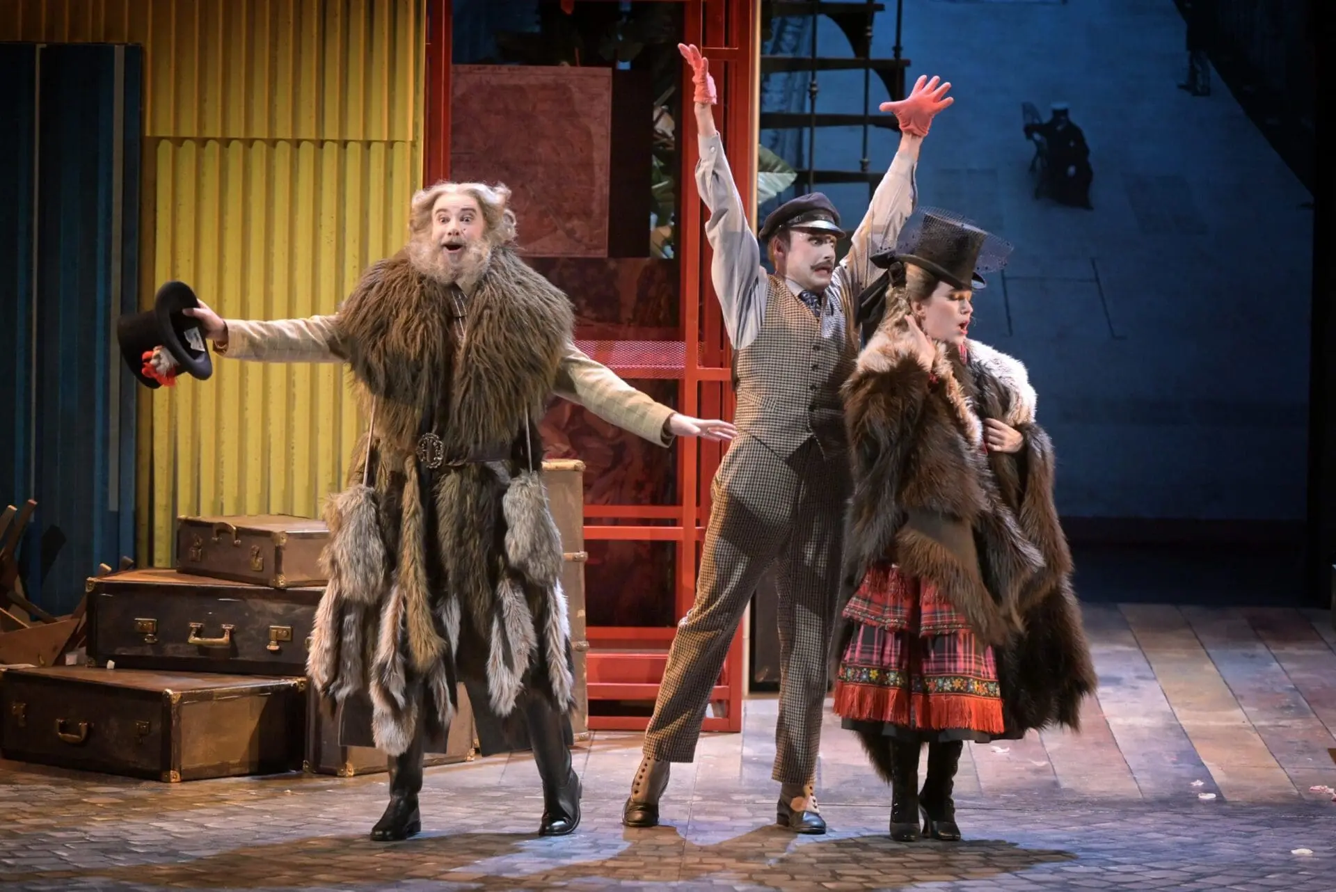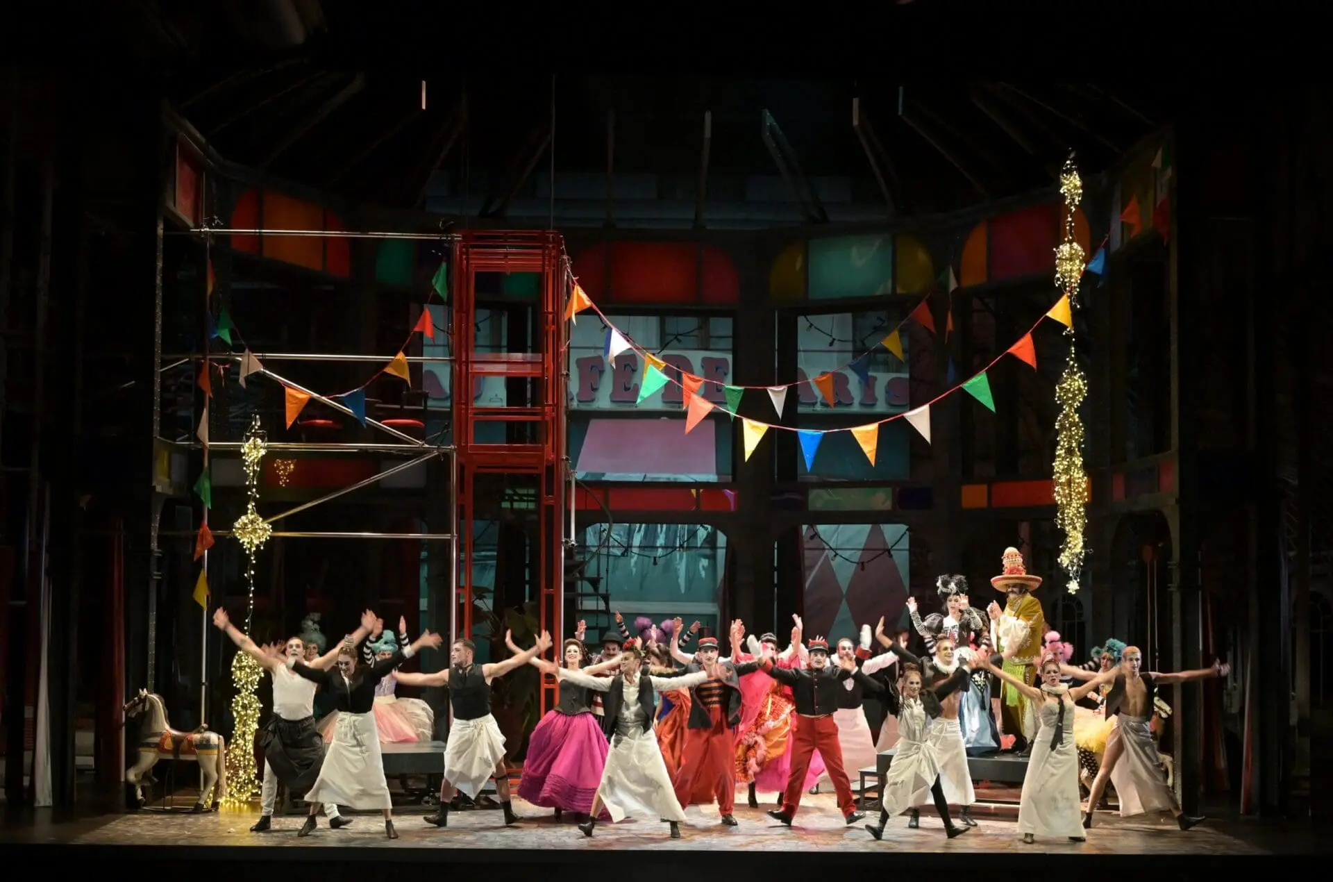 For the sets, Lacroix installs scaffolding, well-worn period furniture, and a few torn canvases in a Gustave Eiffel-like semi-circular structure. With some hasty transformations, these same props evoke a train station, then a private mansion before being revamped as a Parisian cabaret, where grand dames and “cocottes” convene to play tricks on their suitors and husbands. A rickety red cage/elevator at centre stage allows the actors to make precarious entries and escapes, thus adding to the excitement and general confusion. But Lacroix, true to his sense of lacework detail, synchronizes the action to the slightest glance, with very well-timed gags and surprises. But he never pushes to the absurd extremes like those of Australian director Barrie Kosky in his staging of Offenbach’s earlier work Orphée aux enfers in Salzburg in 2019. For Lacroix, the whole piece is absurd enough if you stick to the text.