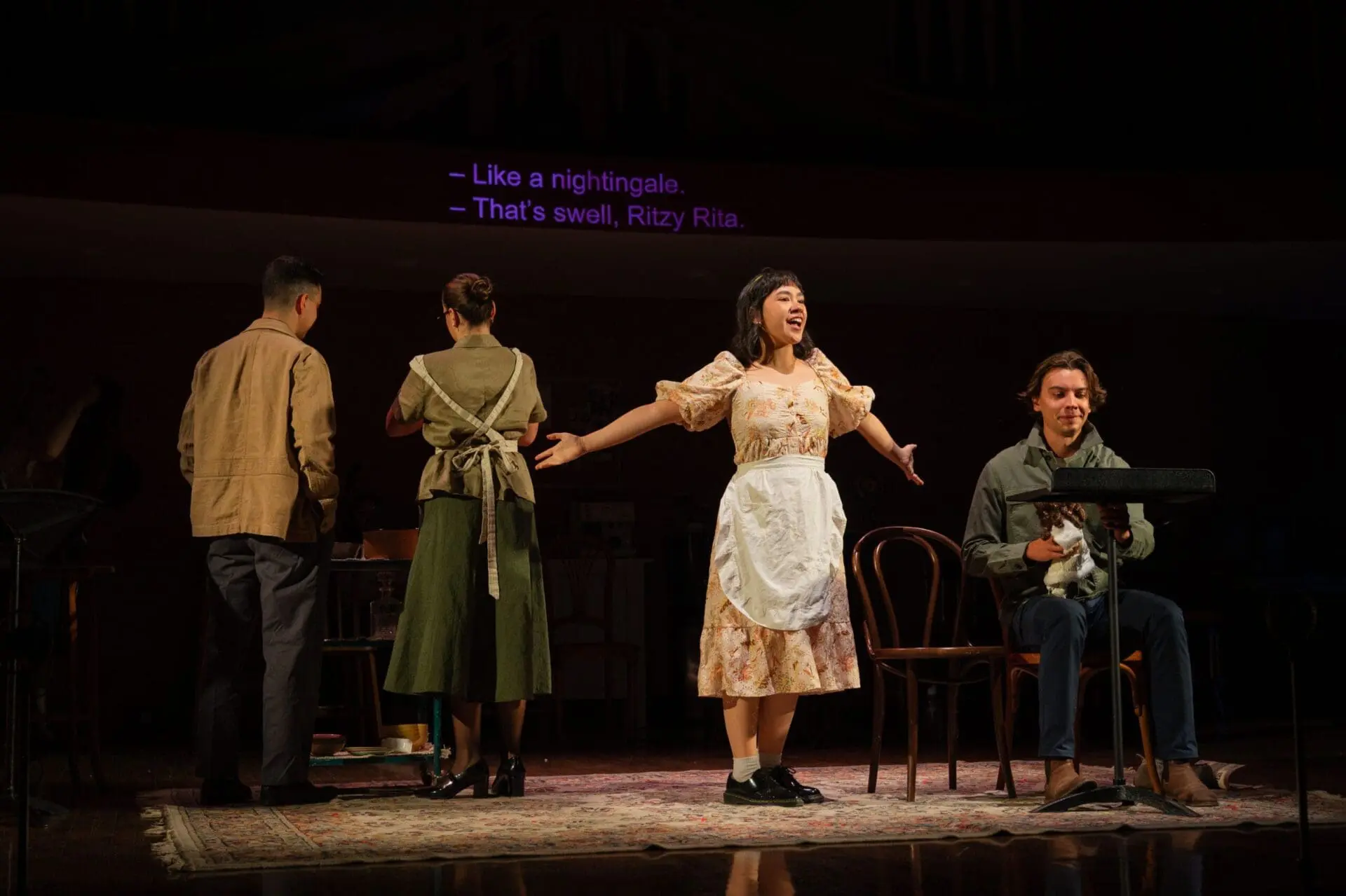 The child Rita (Leandra Dahm) meets new boarder George (Gabriel Klassen) as her uncle and aunt (Matthew Black and Alannah Beauparlant, facing upstage) discuss him