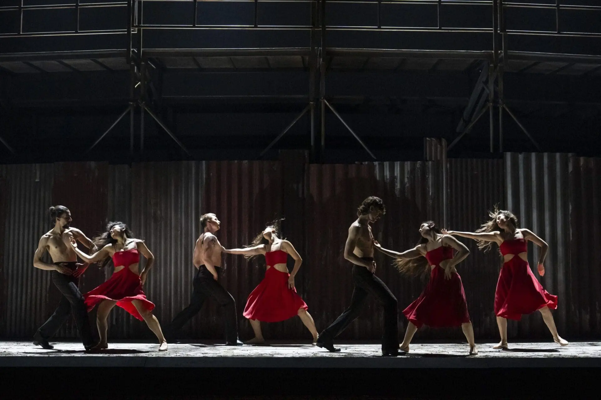 But it’s the fourth act that outdoes them all. Gorgeous choreography features sylphlike topless youths in black trousers dancing with lanky ladies in red, and a motorized bull’s head mounted on a unicycle suggest both the bullfight and the battles of the sexes. Dmitry Cheblykov’s Escamillo brings both gravitas and self-deprecating humour to the role of the toreador who wins Carmen’s love by accepting her need for freedom; while Popov’s Don José dressed in a cheap suit holding a bouquet of flowers like a concealed romantic weapon behind his back exudes the creepiness of a failed used car salesman on the make.