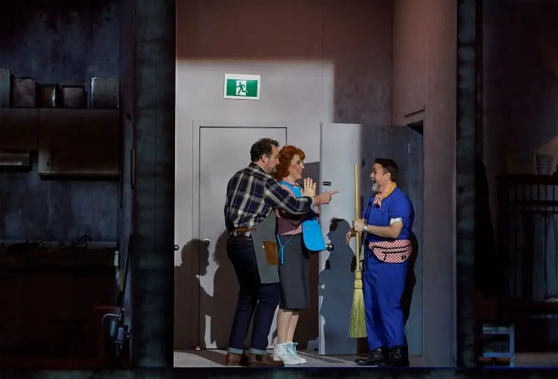 Russell Braun (Peter) Krisztina Szabó (Gertrude) and Michael Colvin (the Witch) in Canadian Opera Company’s Hansel and Gretel. Photo: Michael Cooper.