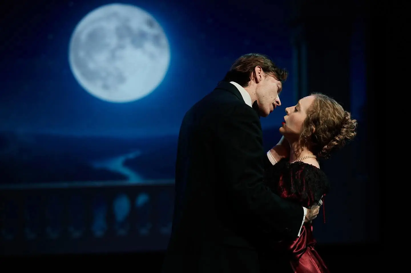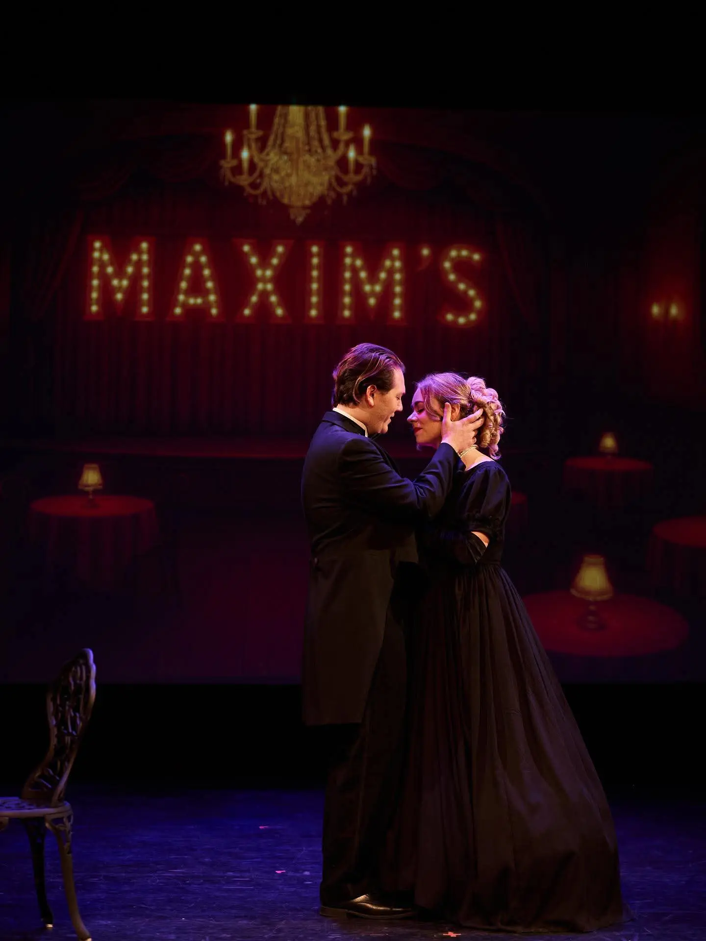 If you went expecting a lavish production, you would have been disappointed. The sets were a few interchangeable benches, tables, chairs and a chaise while the costumes were equally unremarkable with the exception of the widow’s elegant black ball gowns. What saved the day visually were Brenden Friesen’s sumptuous background projections.