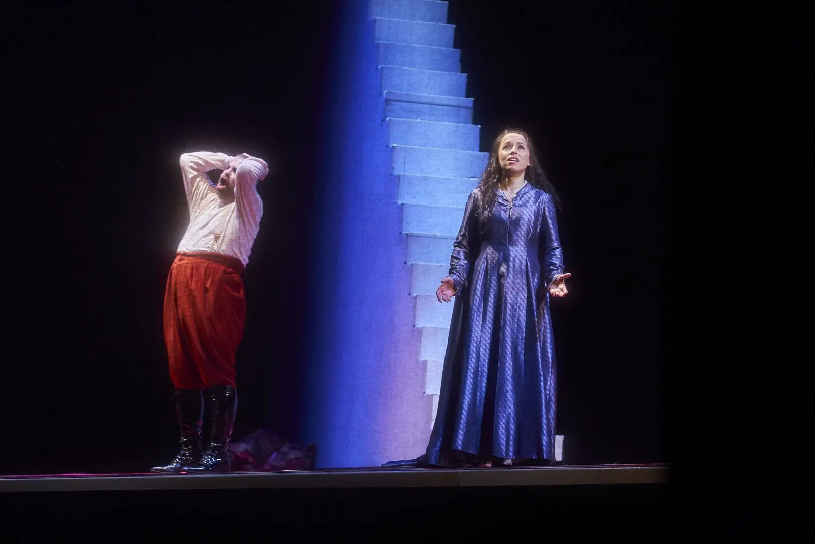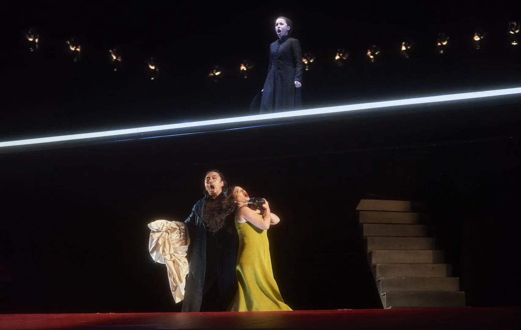 Levine’s set is minimalist. It consists of a large, rectangular hydraulically powered platform that can be raised, lowered or tilted, placed in the deck of a red-carpeted stage bordered on three sides by a wall of red flats. A trap door in the platform facilitates some exits. The lone major set prop is a 23-step staircase in the centre of the platform, a suggestive nod to the house in which Gilda has been installed. The set does allow for an effective staging of the quartet, “Bella figlia dell’amore,” the Duke pawing Maddalena on the forestage while Rigoletto and Gilda stand atop the raised platform. Rigoletto’s appearance after Gilda’s murder is also ingeniously handled, his “walk down the road” effected by stationing him upstage on the platform and letting it, teeter-totter-like, come to rest as a raked stage sloping down to the orchestra pit.