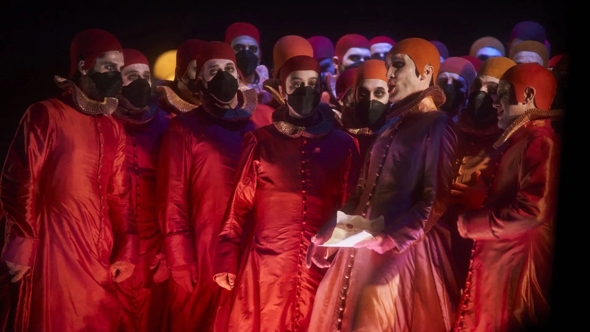 Cor van den Brink’s revival of Reinier Tweebeeke’s lighting is first-rate and Sandy Powell’s costumes, though not exact historical copies, place the action in the 17th century. Courtiers are assembled in nine colour-coded groups from bright orange to dark purple, the older the courtier the darker the colour of the robe. Rigoletto’s costume combines all nine colours.
