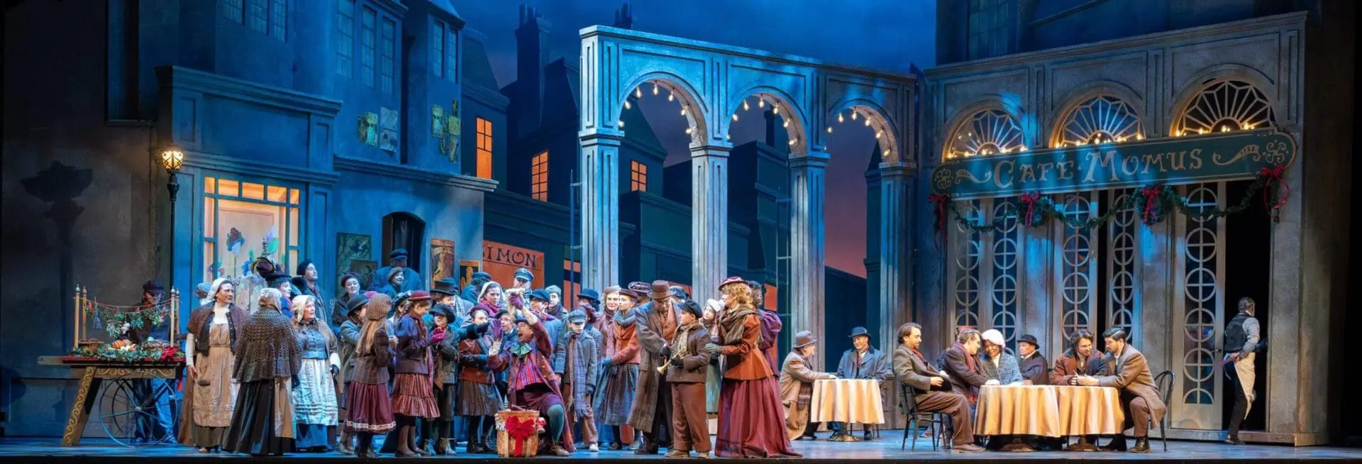 The MO chorus (Tadeusz Biernacki, director) and children’s chorus (Carolyn Boyes, director) light up the Parisian night sky during Act Two’s Christmas Eve street scene. Their delivery was as crisp as the gendarmerie’s rat-a-tat military drums during the “Aranci, datteri! Caldi i marroni!” scene, that included an all-too-fleeting cameo appearance by toy vendor Parpignol (George Nytepchuk).