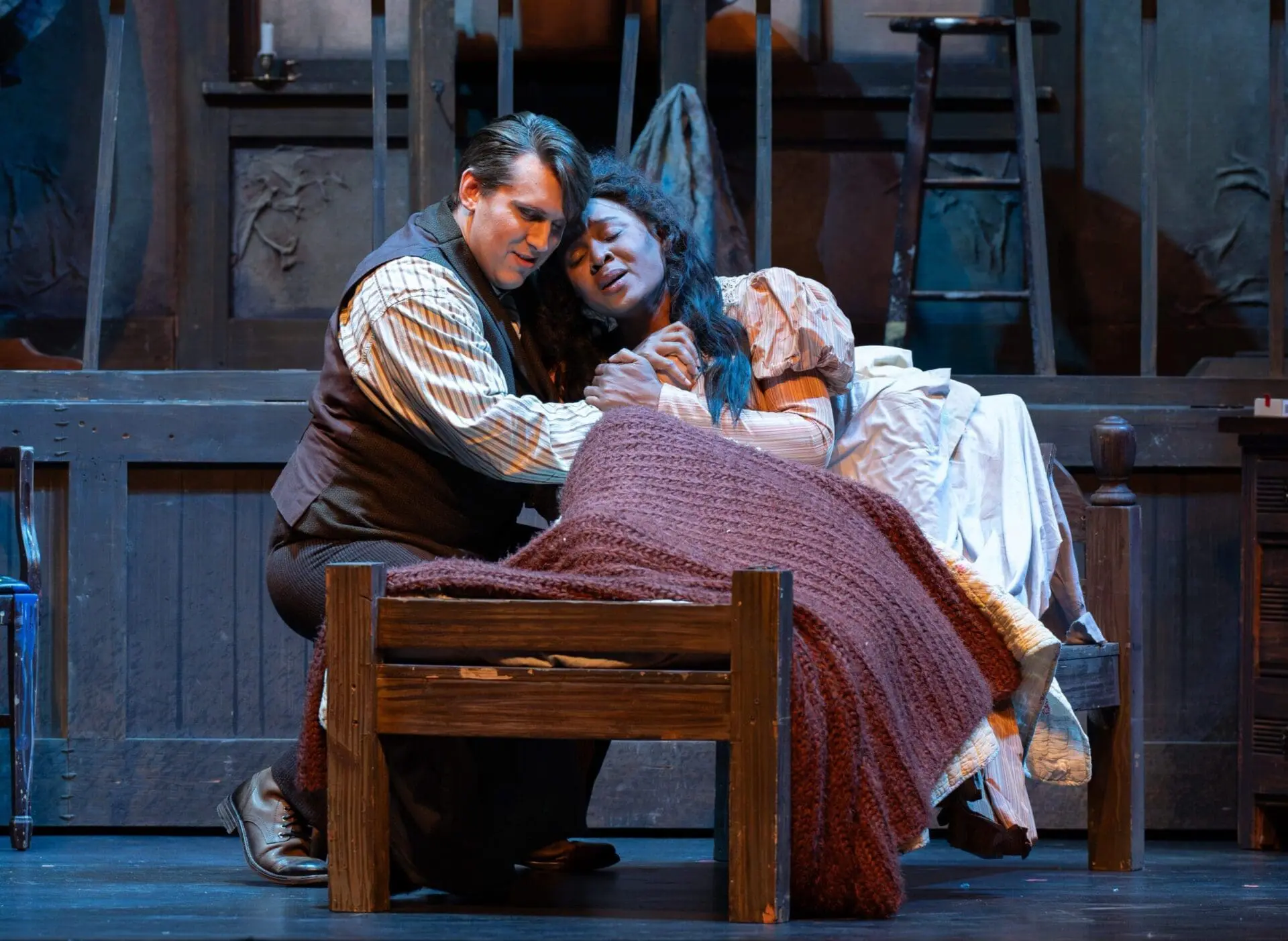 The first of those is Canadian-Cameroonian soprano Suzanne Taffot, a spectacular Mimì with innate acting skills who transforms before our eyes from shy neighbour in search of a light for her extinguished candle to a woman deeply in love as her own life force flickers. She easily won our hearts, as she did Rodolfo’s, during her first act aria “Sì, mi chiamano Mimì,” displaying her gorgeously expressive voice, clear diction and ability to infuse her character with dignified humility as she shares her love for “gentle magic” and spring flowers with the poet. Her performance grew even more luminous as consumption took its grim toll. Her fourth act farewell duet with Rodolfo, “Sono andati?” was a shimmering highlight filled with ringing high notes as she declares “You are my love.”