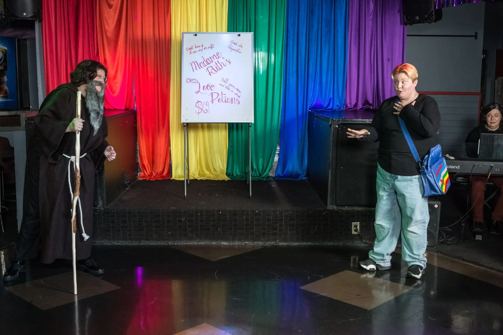 The eight-member, streamlined chorus moves effectively between the club’s barstools, steps and tables as they respond to the action and deliver satisfying, antiphonal harmonies. Music director/collaborative pianist Shannon Hiebert, a fixture in MUO shows, returns with flawless keyboard acompaniment. The choice to have a lone “orchestra member” rather than a slightly larger, multi-instrumental chamber ensemble neatly solves pesky balance issues in the smaller venue that had arisen in prior MUO productions.