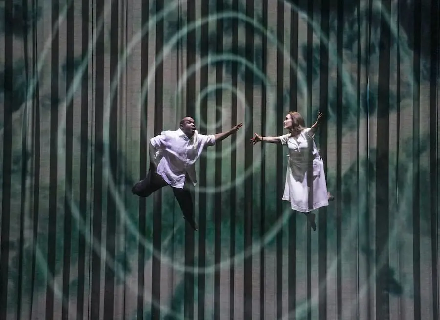 How often does an opera audience seem united by one big, heady communal high? That was the feeling at The Metropolitan Opera’s new Die Zauberflöte on May 22, a giddily joyous experience that sent me home in buoyant spirits. Simon McBurney’s tirelessly inventive, contemporized production, first seen in Amsterdam in 2012 and since then at the English National Opera and the Festival d’Aix-en-Provence, is at once simple and enormously complex, a combination of old-fashioned stagecraft and latter-day technological savvy. Michael Levine’s deftly mutable set isn’t much more than a cable-suspended rectangular platform on an otherwise bare stage, an elevated orchestra pit, and a passerelle. Far left on the stage apron, a blackboard-toting artist (Blake Habermann) sets up shop, sketching words and pictures that are projected (along, occasionally, with his busy hands) onto a scrim: “eine felsige Landschaft” becomes a charmingly childlike drawing of the rocky landscape in question. His counterpart to the far right is an equally busy Foley artist (Ruth Sullivan), a varied arsenal of evocative noises at her disposal. Performers enter and exit from the Met’s aisles and side doors; the orchestra’s principal flutist Seth Morris gets commandeered by Tamino for a stint onstage; and staff pianist Bryan Wagorn is likewise recruited to man Papageno’s glockenspiel. (He makes a very funny tardy entrance in act 2, coffee cup in hand, having momentarily left the resourceful birdcatcher to fend for himself.) Sarastro, dressed like a hip contemporary CEO, takes to the passerelle with microphone in hand to address his opening remarks straight to the audience, then repairs to the stage to chair a meeting of his “board” at the conference table that’s the versatile central platform’s (it rises! it falls! it tilts!) latest guise. For their climactic trial by water, Pamina and Tamino “swim” aloft, high above the stage floor.