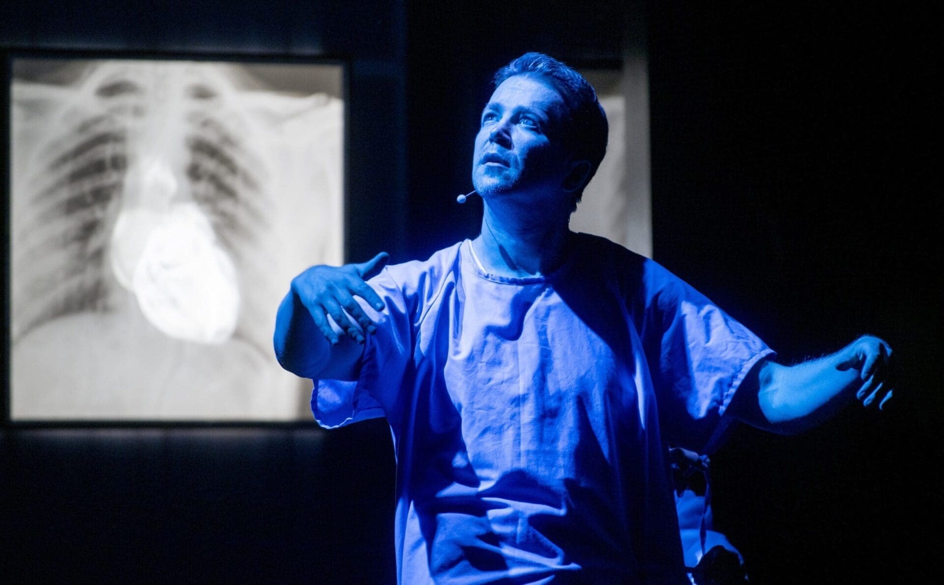 Although there were suggestions of storylines, most of the interpretations of Cohen’s work arrived at a kind of universality, exploring the themes of love and death. The props and set design (by Amir Ofek) were simple but effective: a table, a chair, a suitcase, a bottle of wine and two glasses (revealed during “Treaty”), and later doctor’s and patient’s gowns donned in “One of Us Cannot be Wrong” (“I showed my heart to the doctor / He said I’d just have to quit”) and the x-rayed image of a heart. Lighting design by Itai Erdal and the suggestion of whiteface makeup on the mute Littlemore lent the feel of a silent film. Musical arrangement by Adrian Dolan and the work of dramaturg Raïna von Waldenburg helped transform the evening into one of Cohenesque metatheatre.