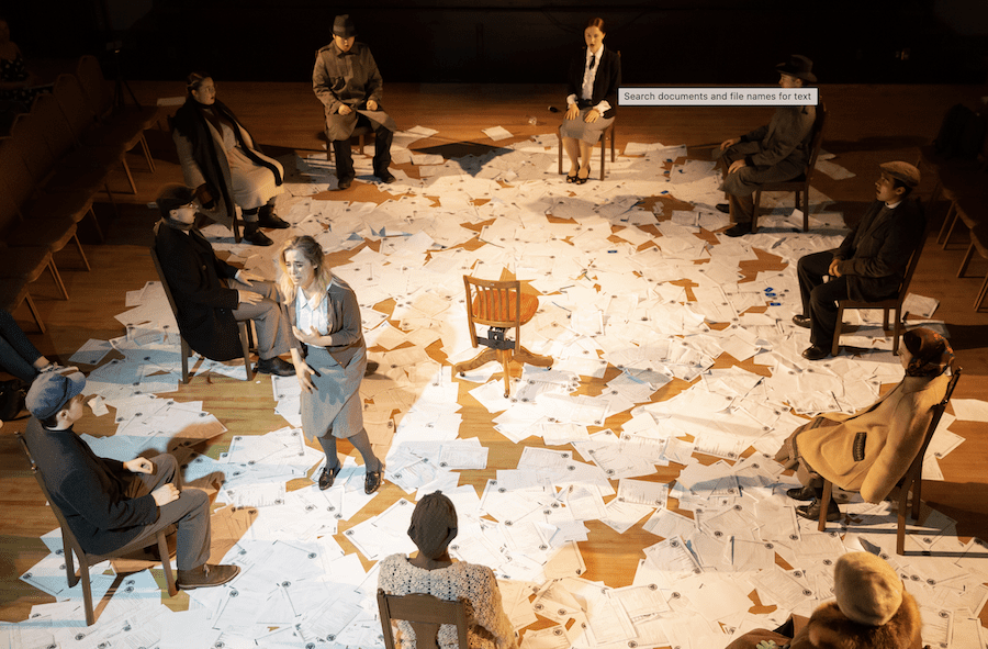 The set was a squeaky hardwood floor, every inch of which was covered with official-looking papers, a nod to the storyline’s indictment of opaque, heartless bureaucracy. Other props were brought in and efficiently removed as the three grimmer and grimmer acts unfolded. Deedrick is deft at shaping the scenes theatrically and fluidly, making it easy to ignore the rudimentary venue he was working with.