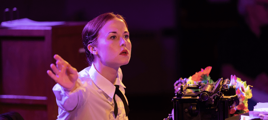 The broken heart of the piece is Magda, wife of political dissident John Sorel, who’s on the run from the fascist authorities, and is hoping he can rejoin his wife and their infant child, across the border in a safer country. It’s Magda’s need of a visa to exit that drives her Kafkaesque battle with the faceless state, a losing battle that ends with her slumped over a wooden swivel chair, dead from an overdose (she puts her head in an oven in the original).
