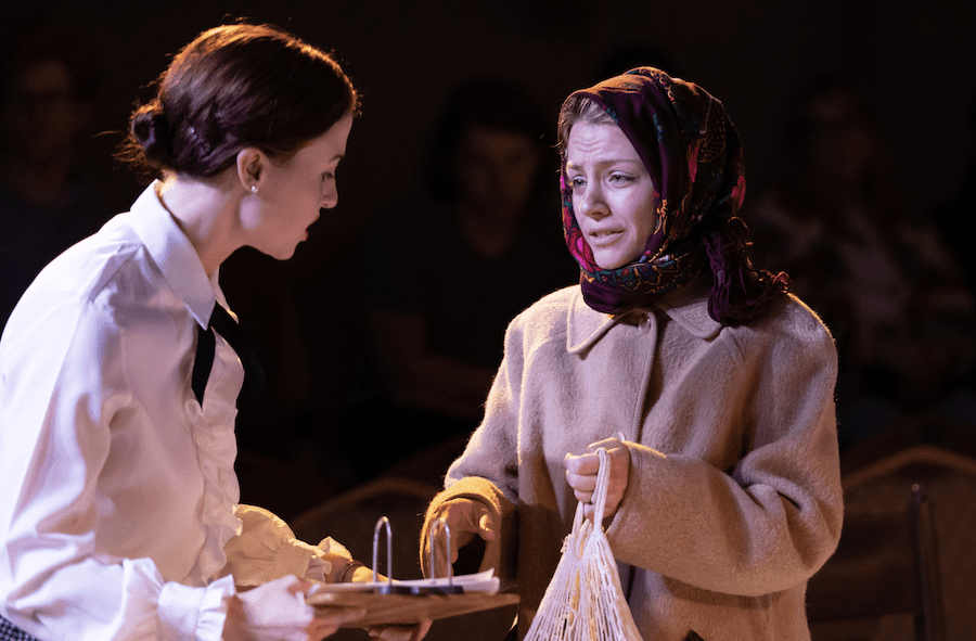 One character in the opera is a “foreign woman,” a refugee seeking documents but unable to communicate in the language required. The nationality of the “foreign woman” isn’t specified in the original, but in this production, Anastasia Pogorelova portrayed her as Ukrainian, wearing a floral headscarf. Pogorelova conveyed the helpless woman’s deference and impotence convincingly.