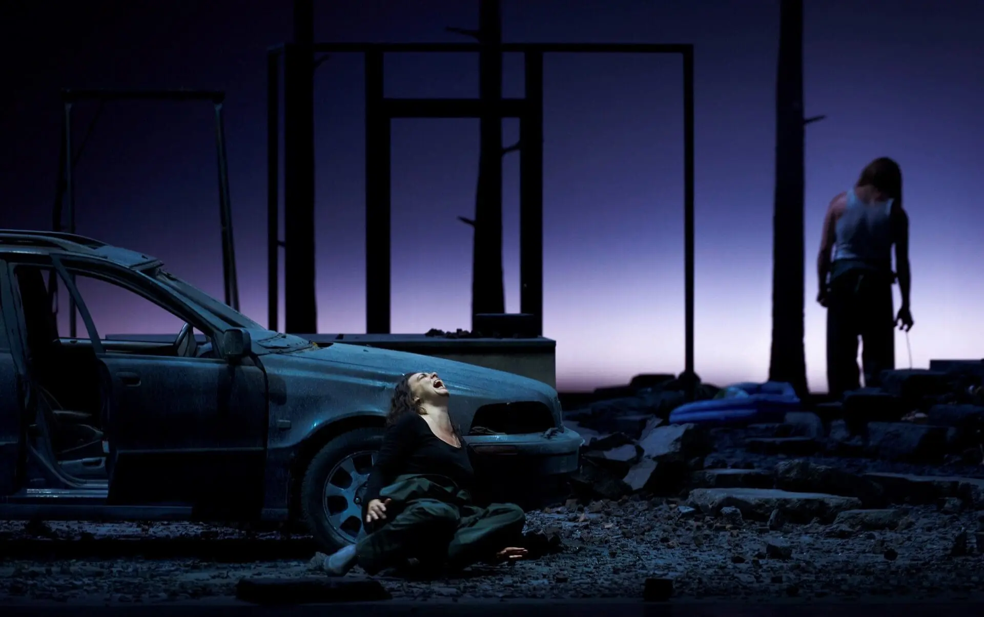 Kratzer and his frequent co-creator, set and costume designer Rainer Sellmaier, updated the action to a dystopian future framed by nuclear Armageddon. The family now lives in a bunker decked out as a modern-day kitchen/living room with an adjoining pantry. An access ladder allows for entries and exits through the bunker’s ceiling. Hazmat suits with masks are worn outdoors amidst the blackened, soot-covered debris that includes the family’s burnt-out four-door sedan which, amazingly enough after years of nuclear winter, has a functioning battery that powers the dome lights when the doors are opened.