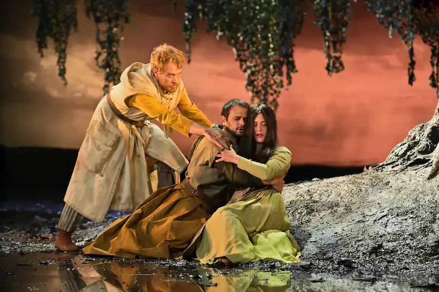 Then the curtain rises to reveal an arabesque of patterned metal frames highlighted by fluorescent bars and rings, a reference to crusader-era Palestine imagined by designer Bruno de Lavenère. Later an ancient, gnarly, bent tree, a witness to momentous historical events, becomes the central ecosystem of the drama where moss grows thick, demons emerge from under the roots, and singers deliver their arias perched high on its branches.