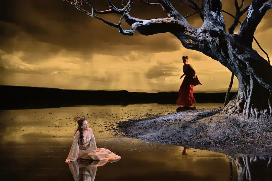 Swiss director and actor Lilo Baur employs these designs and Alain Blachot’s striking costumes in her subtle storytelling. Formerly a member of Simon McBurney’s troop, Théâtre de Complicité, famous for its collaborative methods, she masters her craft on all levels: visual, musical, and theatrical. There are references to Armide’s past, for example, in her multiple layers of parchment clothing, illuminated manuscripts, telling the tales of wars and victories, and her own against the crusader armies of King Godefroi of Jerusalem. She has seduced the enemy soldiers with her magic powers and famed beauty, but one of them, Renaud, resists her and eventually becomes her nemesis. Laurent Castaingt’s lighting and videos shift from landscapes to seascapes and storms to fair weather as if controlled by the whims of heavenly powers.