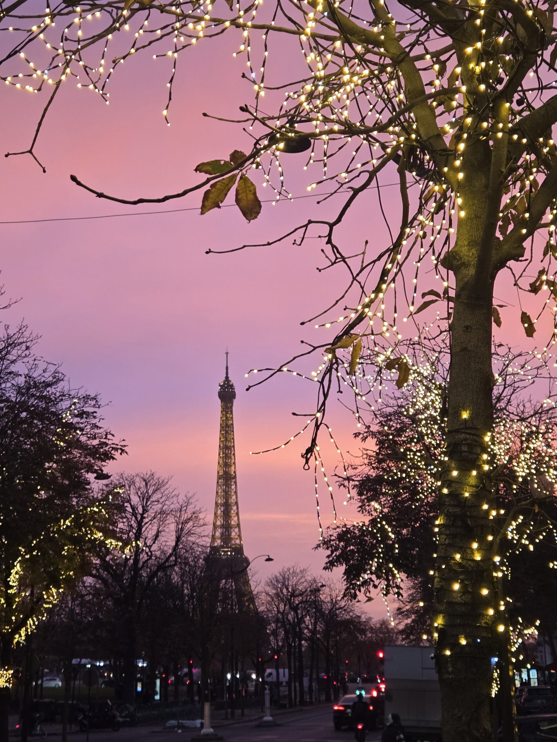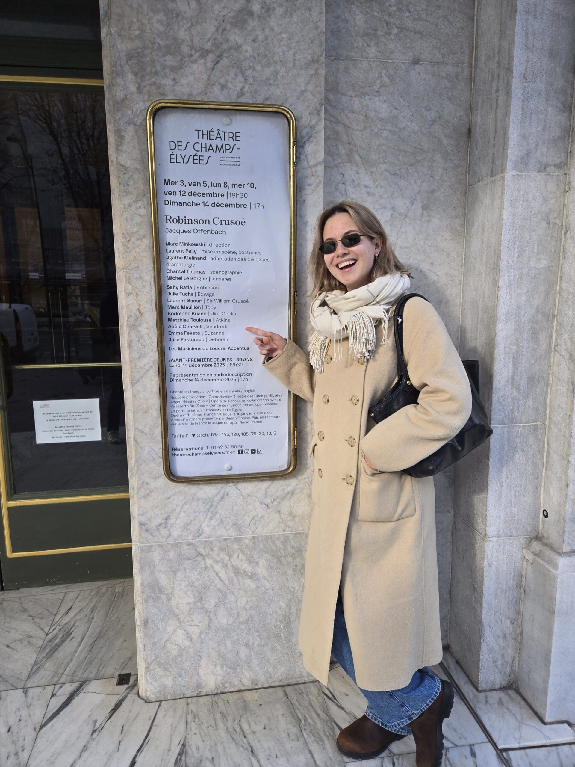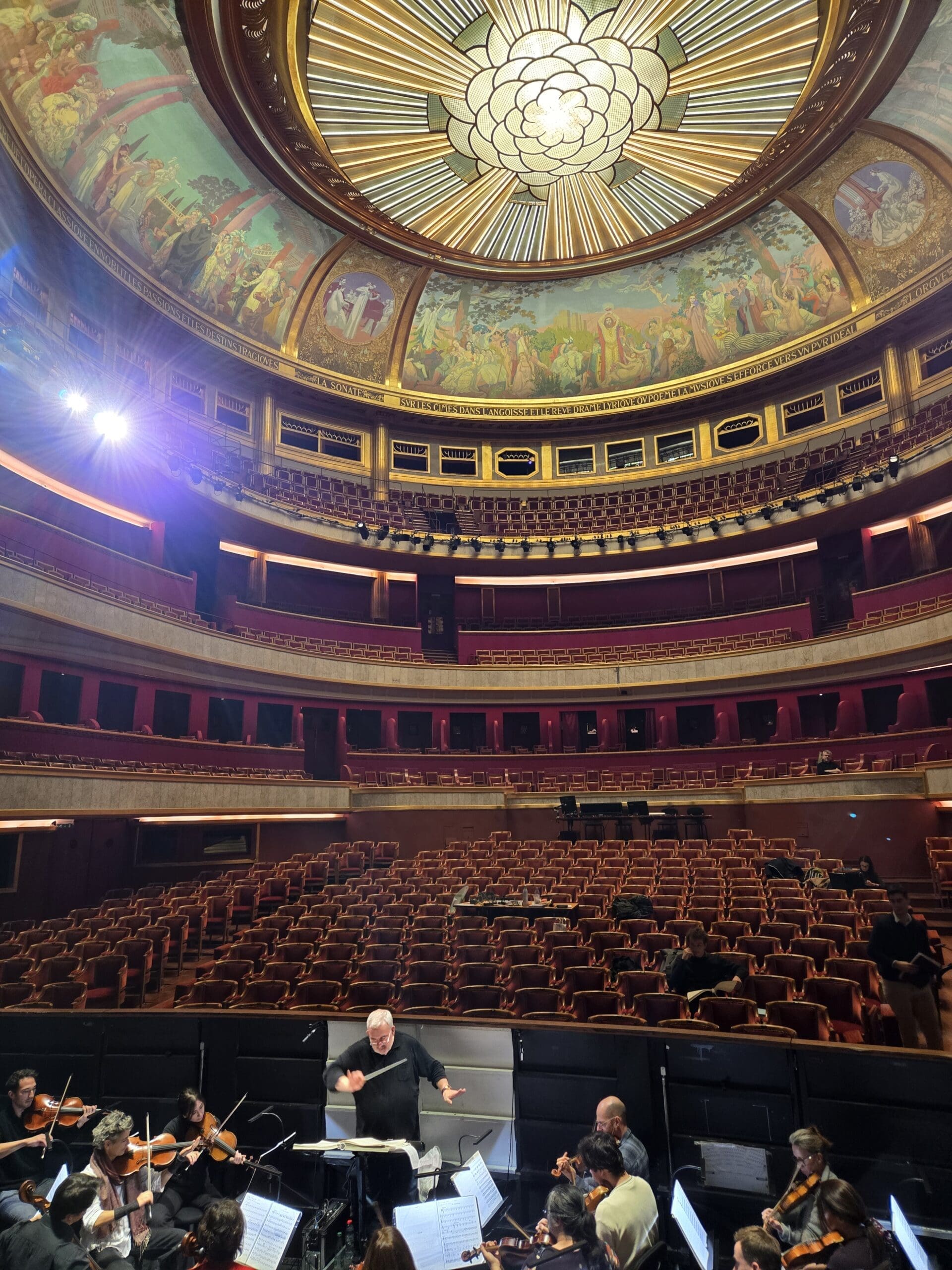 The Théâtre des Champs-Élysées is a jewel box of Art Déco elegance, right on Rue Montaigne, which means biking past sparkling luxury shop windows on my way to rehearsal. Being here in December is extra special, because the whole street is lit up for the holidays. The top floor of the TCÉ has an incredible view of the Eiffel tower, and the staff is always so welcoming, kind and generous.