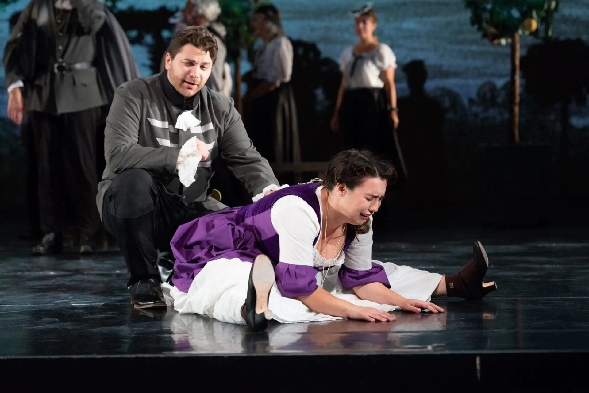 As the older and more dramatic sister, Fiordiligi, Holly Chaplin delivered a show-stopping “Come scoglio,” complete with rapid ornamentations and soaring high notes which elicited prolonged applause. Together, Chaplin and Quinsey were a comic force, and their “Ah guarda, sorella” showed that as a singing duo they were equally powerful and beguiling.