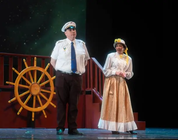 Penelope Cookson’s direction was imaginative, yet not too chaotic, giving all singers a clear sight line to the conductor. Gabriel Cropley’s and Robert Kisin’s lighting direction showed effective use of projections as backdrops, and the use of the giant British flag at the end being particularly delightful. Frank Pasian’s set design was elegantly simple. Amanda Eason’s costumes were creative, and the female costumes’ bright hues were striking. My only quibble is that Captain Corcoran’s short-sleeved shirt and peaked cap looked more like those of Captain Stubing on The Love Boat than a Victorian naval captain.