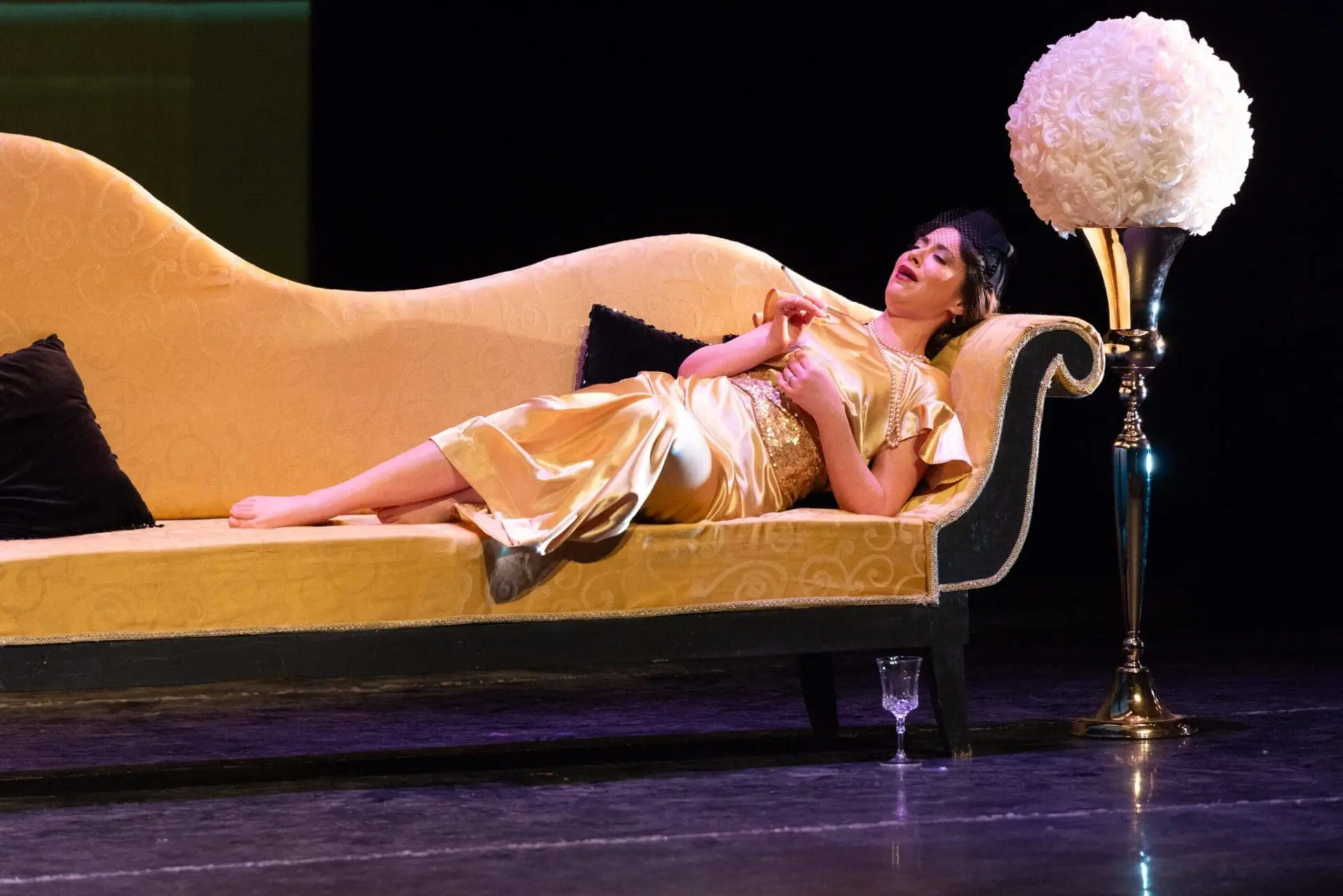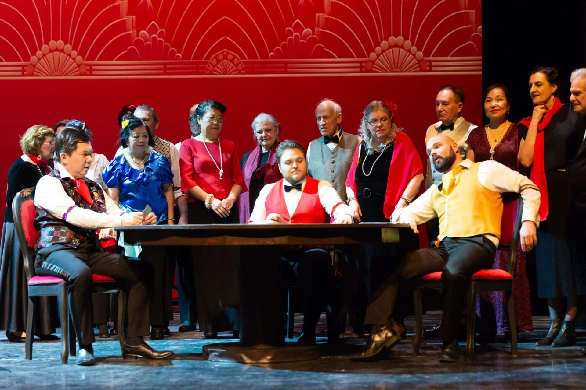 The set, by Lin-Mei Lay, Frank Pasian and Robert Kisin, was simple, suggested by furniture pieces and lovely projections that hinted at art deco design elements. The red for Flora’s party, well-mirrored by Amanda Eason’s costumes, was particularly striking. The director, Stephen Carr, also kept things minimal and offered a traditional staging of the opera. The simplicity of his direction did not work perfectly for all the principal singers, some of whom struggled with movement and gestural languages that felt unmotivated.
