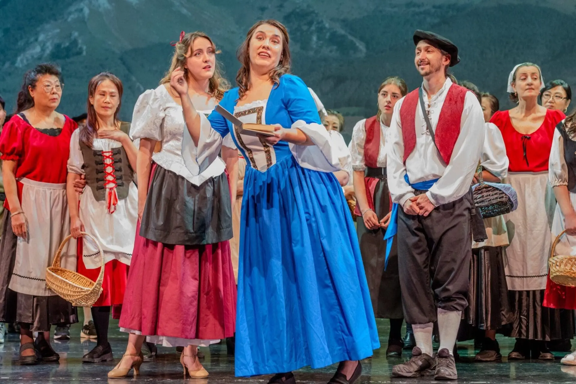 John Holland was a hilariously arrogant and shallow Belcore. His voice was most impressive during ensemble and chorus work, and his clarity during patter passages was well done. Andrew Tees was an imposing and witty Dr. Dulcamara, whose booming bass voice and splendid stage presence made for comic magic during his “Udite, udite, o rustici.” His vocal strength in large chorus work was impressive, and the contrast of his rich lower tones with Cappellazzo’s clear tenor tonality in their first act duet was magical. Grace Quinsey’s Giannetta was a vibrant stage presence whose strong voice commanded the audience’s attention. Her “Saria possible?” in Act Two was comically and vocally delightful, particularly with the interaction of the female chorus.