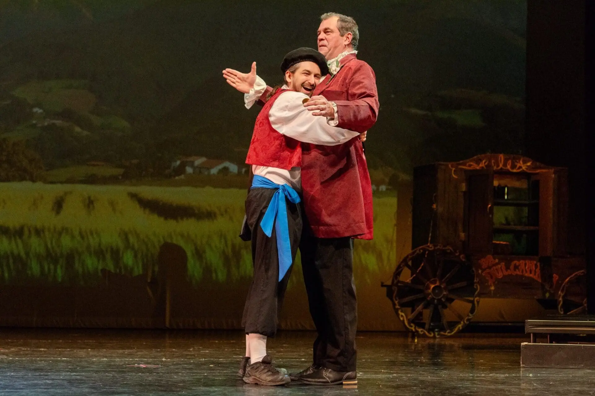 Nemorino (Alexander Cappellazzo) and Dr. Dulcamara (Andrew Tees) in The Elixir of Love at Opera York