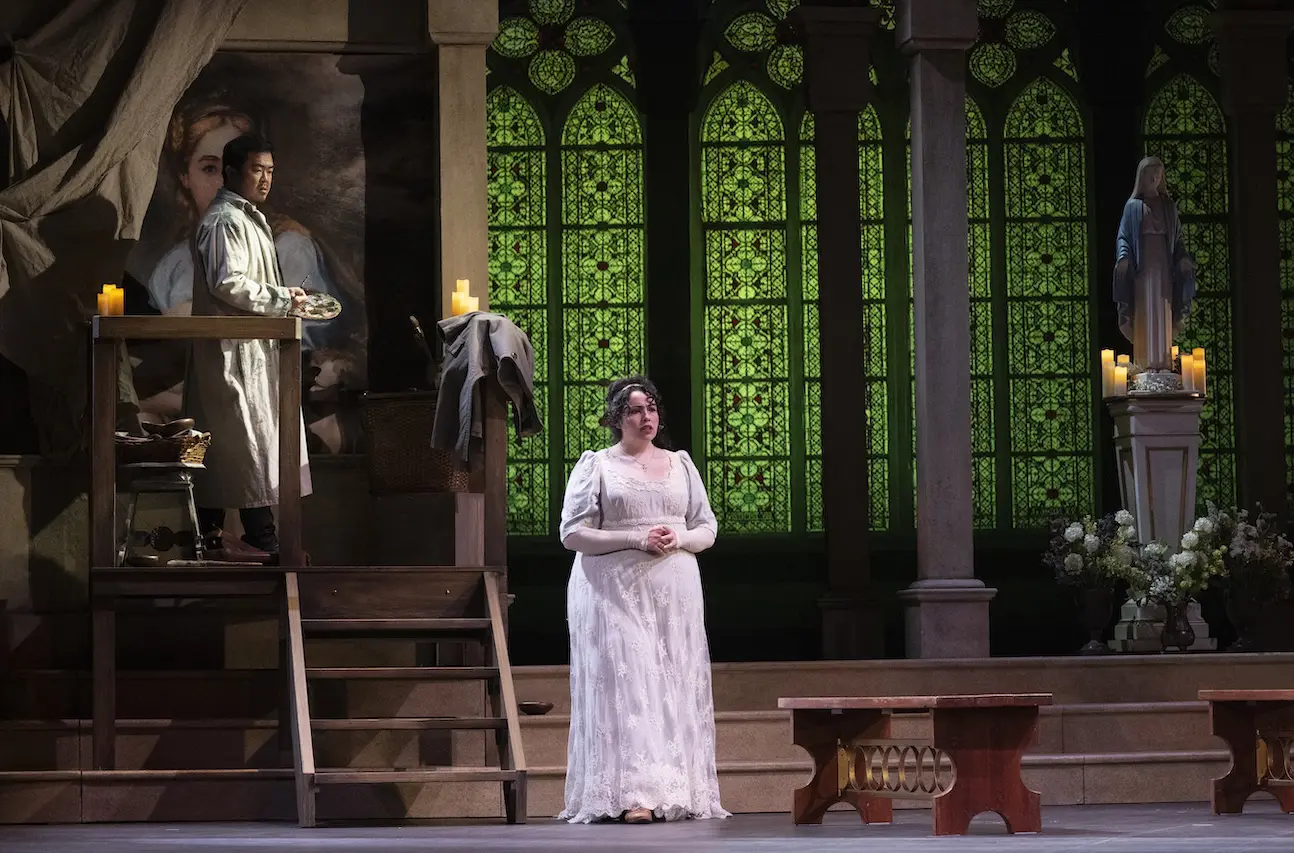 Chinese tenor Yongzhao Yu has, over the past few years, made major moves into the most significant US opera houses, including the Met, and for good reason. As Cavaradossi, his voice gleamed with emotion and power in “Recondita armonia,” the aria at the very beginning of the opera where he declares “My only thought is of you, Tosca, it is of you!” even as he paints a blond, blue-eyed Mary Magdalene. But when the dark-haired, brown-eyed Tosca sees the portrait, things do not go well.