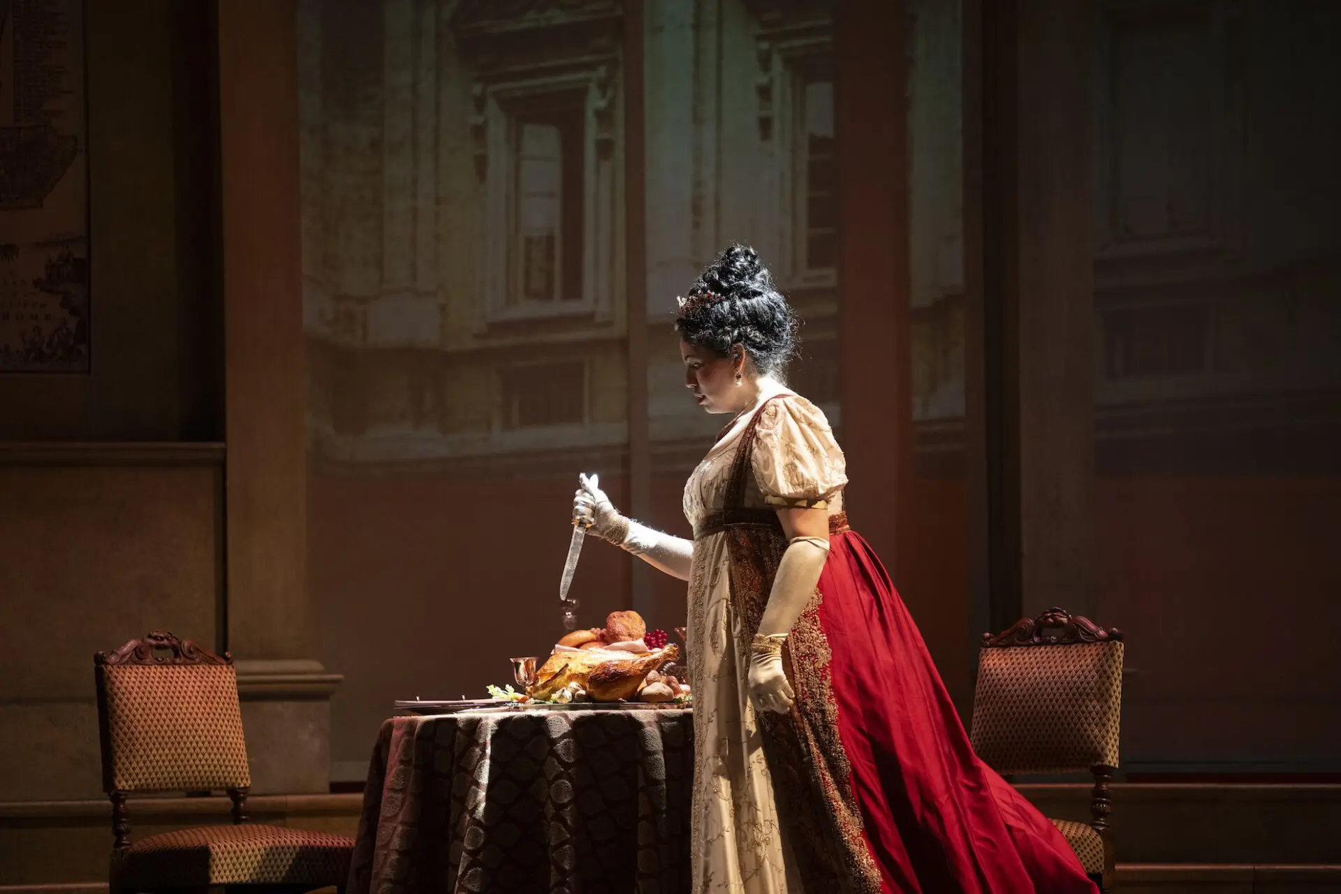 The set, by designer Scott Reid, with its references to classical Roman architecture, was both lovely and practical. The projections he also designed were, however, a mixed bag. The static images behind the arches – stained-glass windows for the church, a starry night over Rome from the roof of Castel Sant’Angelo – were beautiful and effective, but the moving projections, which included shadows of Roman citizens slowly promenading behind a scrim during intermission, tended to feel fussy and unnecessary. The costumes, supplied by the Canadian Opera Company, were appropriate to the tone and feel of this production.