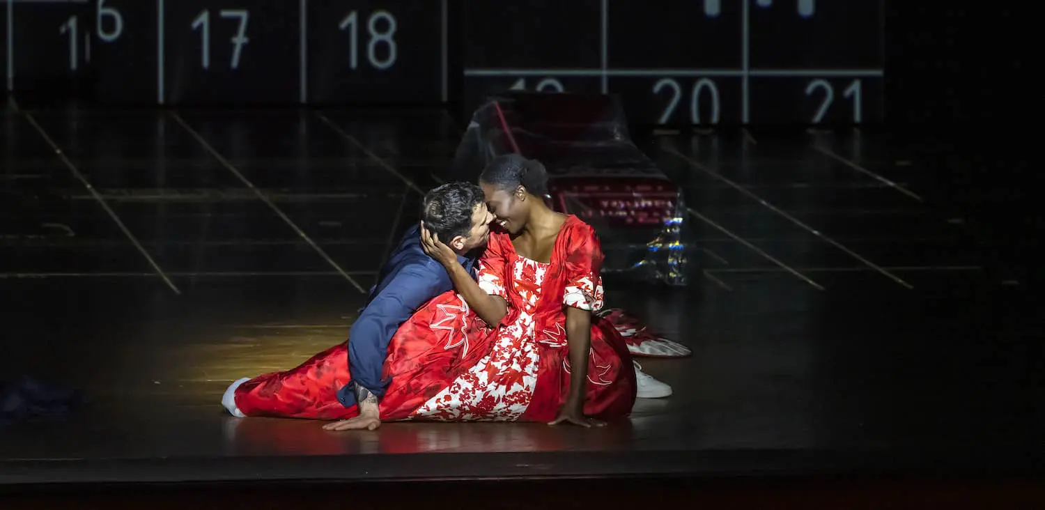 In Act III, a video casts a game of shadows in the background, taking us from the costume department to the women’s chorus dressing room, then to a dance studio where the “petits rats” (little rats, an affectionate term for Paris Opera ballet school dancers) are training. For the opening of act IV, one of them, Barberina, exits from the Count’s dressing room, her torn tutu leaving no doubt as to what she has just lost—”L’ho perduta,” poignantly sung by Lobel-Torres.