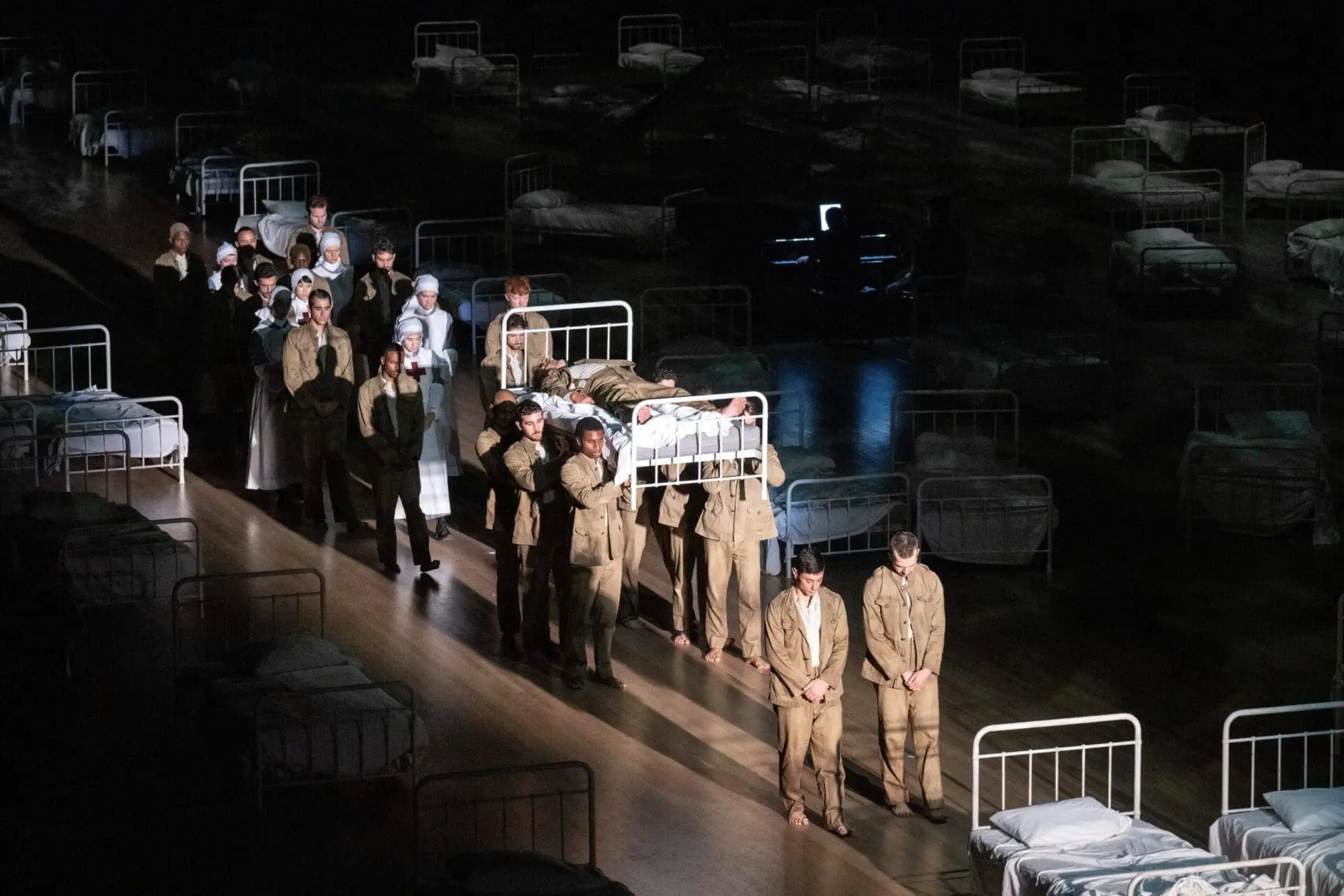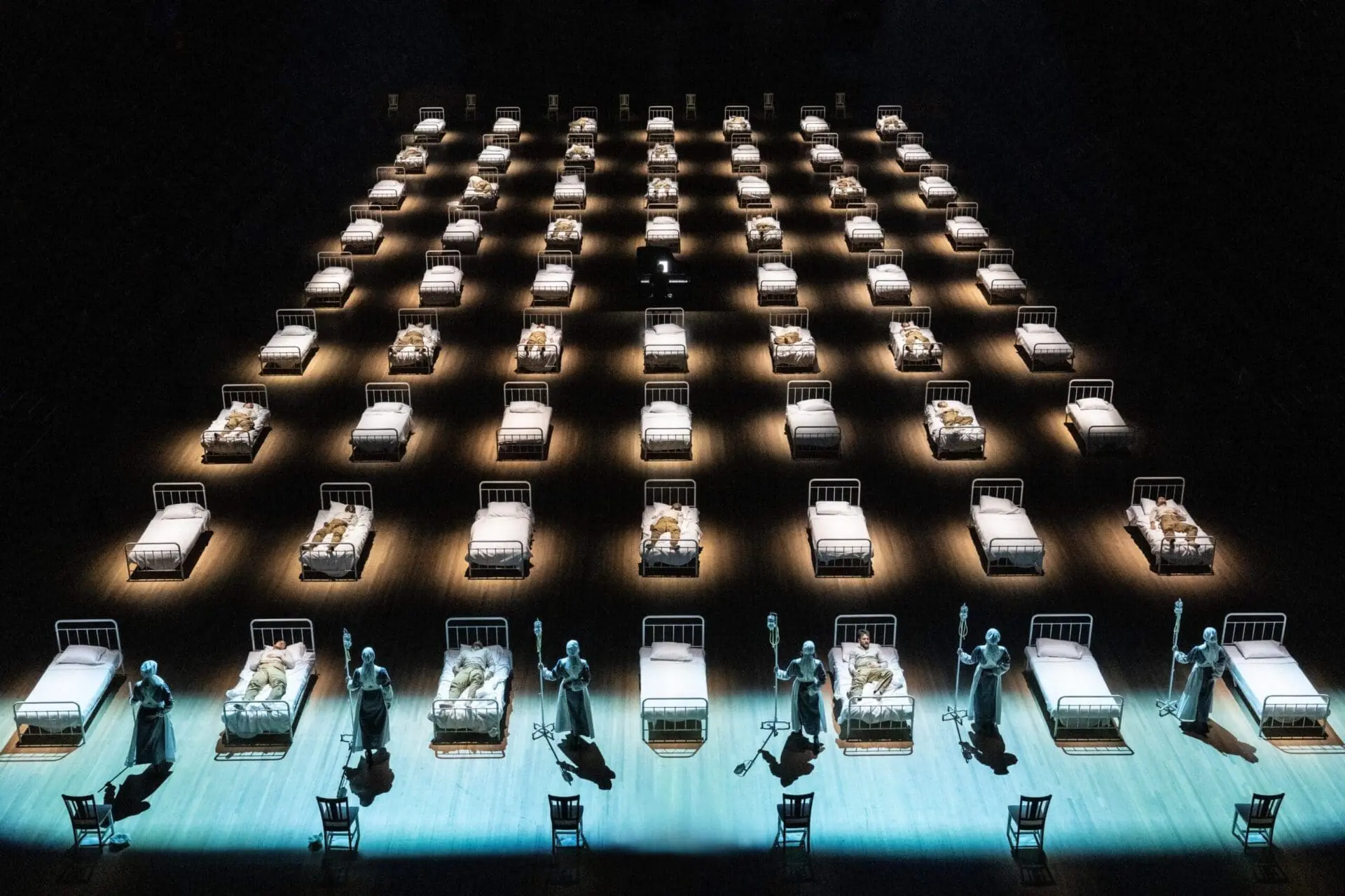 The audience—occupying, length-wise, the north and south sides of the hall—enters to ominously ambient sound and to the sight, in Michael Levine’s typically spare and striking design, of row upon row of old-fashioned metal-frame hospital beds, a third of of them occupied by sometimes still, sometimes restless recumbent figures; in the center sits a grand piano. That first experience of Levine’s setting afforded, for me, the production’s most memorable moment. Once Helmut Deutsch, having unabtrusively taken his place at the keyboard, began to play, unamplified, the ominous opening bars of “Kriegers Ahnung” (traditionally the collection’s second song, but here the first), and Kaufmann rose from one of the dozens of beds and began to sing, amplified, the misgivings set in. Was the star tenor lip-syncing?, I wondered, so disjunct were the singer and the sound; but no, he eventually stood six feet in front of me and I could hear that he wasn’t.