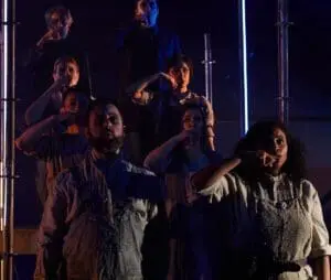 This production of Vivier’s Kopernikus holds true to AtG Founder and Artistic Director Joel Ivany’s 2017 staging of the show at the Banff Centre for Arts and Creativity, with set and lighting designer Jason Hand utilizing the multiple floors of Theatre Passe Muraille’s main stage in addition to a large piece of scaffolding. Lighting is extremely poignant, with cool tones setting the environment of the underworld efficiently. The use of LED lighting along the rails of the scaffolding in the second part offers a welcome change to the visual environment.