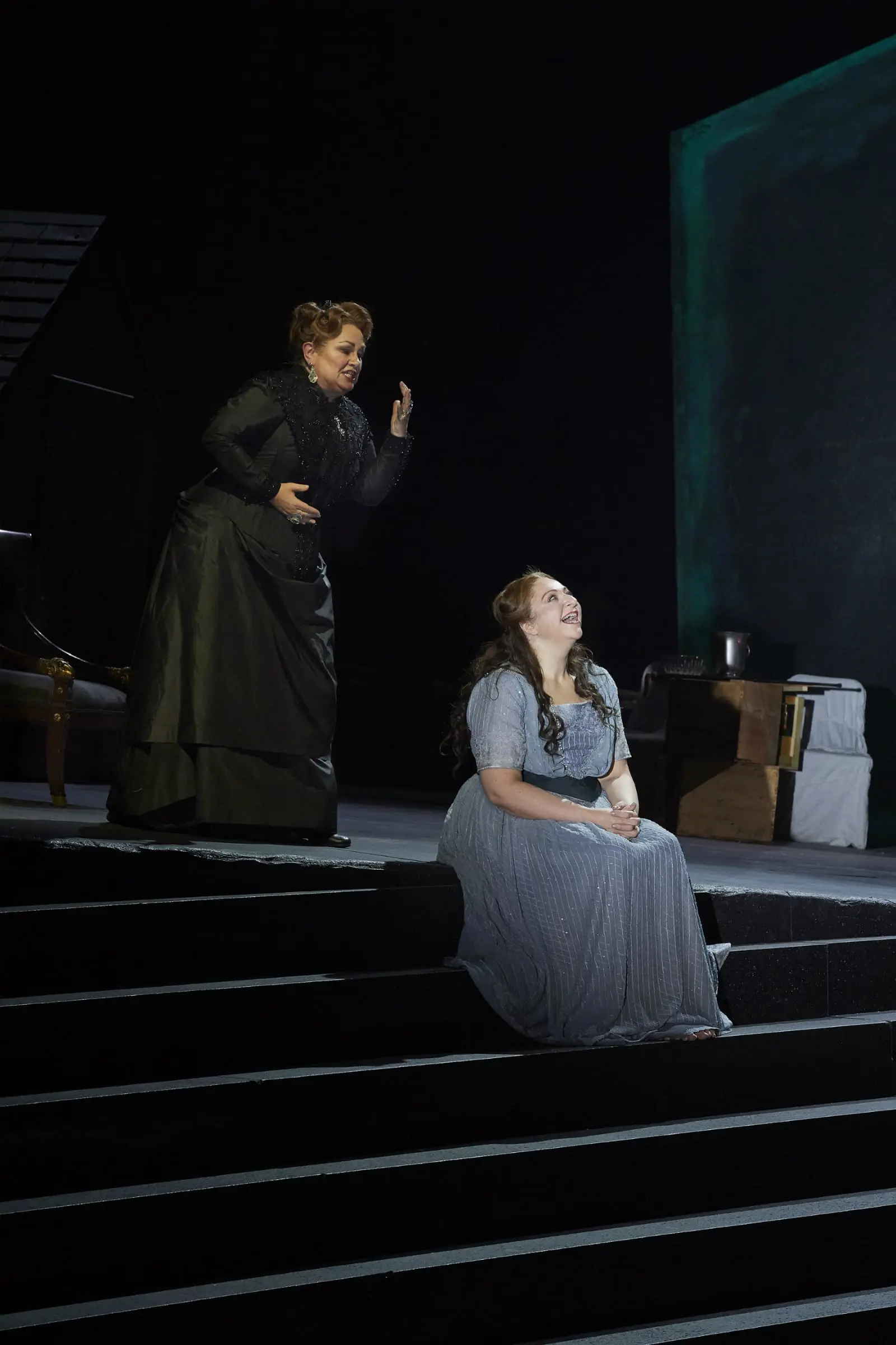 In this revival of the COC’s 1997 production (seen Jan. 26th), Robinson and Costume Designer Anita Stewart have replaced their original abstract, expressionist concept of an indeterminate era with designs that are more historically specific. From the opening scene with the maids in the grubby courtyard discussing Elektra’s fate while tidying up and stoking the fire, we are in the 19th century. They could be working inhabitants of an estate, roughing it up in the bush in the way of Susanna Moodie, or perhaps stuck in a decaying manor on the British moors. Both sisters wear dresses that have seen better days: Erin Wall’s Chrysothemis trying to look more put-together and marriageable; Goerke’s Elektra, wild and barefoot. Together with brother Orest (bass Wilhelm Schwinghammer) as a Victorian gentleman returned from foreign travels, the trio has not a small hint of the Brontës about them, and of the Brontës’ obsessed and cursed characters.