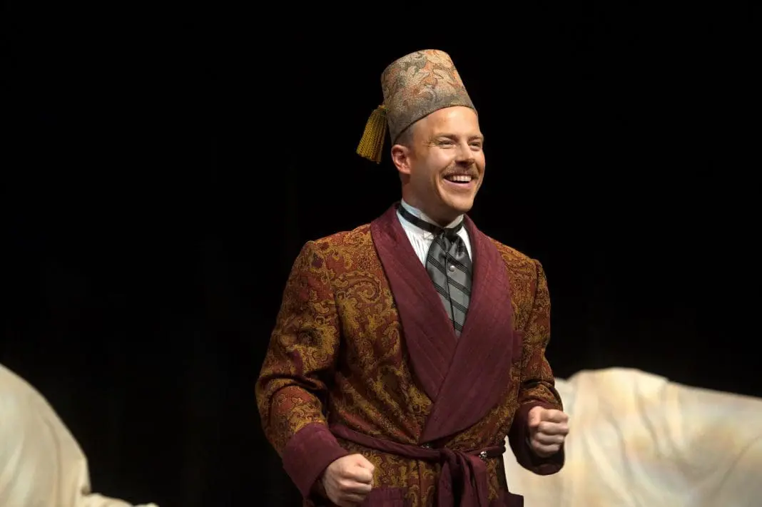 Among the women, both Lara Ciekiewicz (Rosalinda) and Caitlin Wood (Adele) sang well and acted their scintillating best. Ideally, I would have preferred their timbres to have greater contrast, maybe a lighter-voiced Adele and a more spinto Rosalinda, but that’s a minor quibble. Ciekiewicz sang a very nice “Csárdás,” and she’s adept with the tambourine! Wood’s “Laughing Song” was a highlight. Veteran TOT soprano Elizabeth Beeler made a rare outing in a trouser role as Orlofsky. She looked great, and delivered a convincing fake Russian accent. She didn’t yodel her way through “Chacun à son goût” like most mezzos, although one could tell the music didn’t sit comfortably in her voice, betraying an occasional slow vibrato. Olivia Morton was an engaging Ida, who in this show for some reason is called Sally.