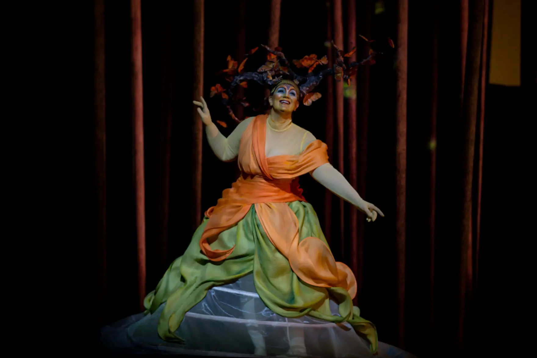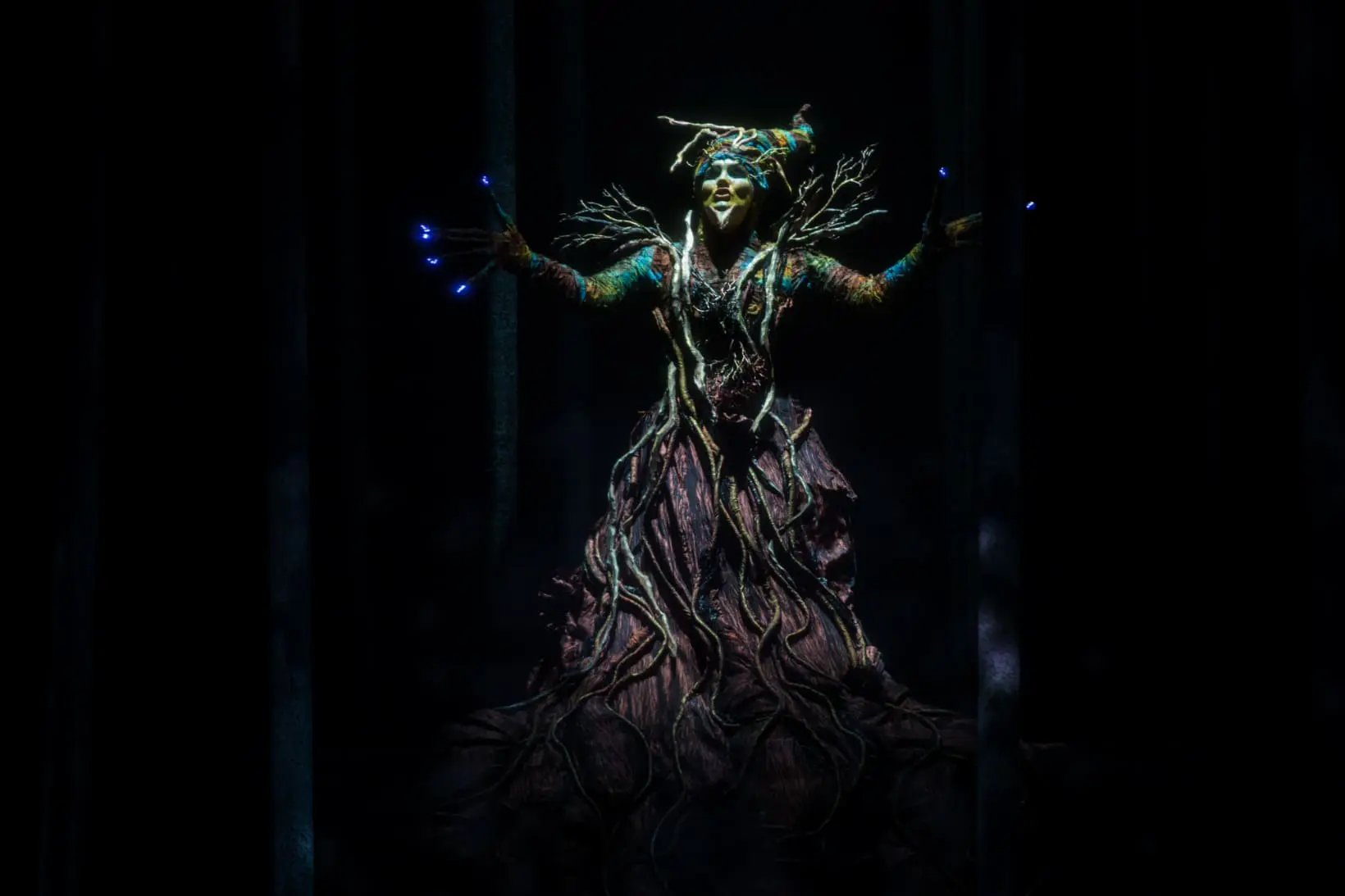 Scenery designer Camellia Koo erected 150 custom-built trees to create a leafless forest. It was a practical way to leave open space through which the singers could project, and to deliver the image of a stark grotesquely cartoonish abominationand dangerous place.