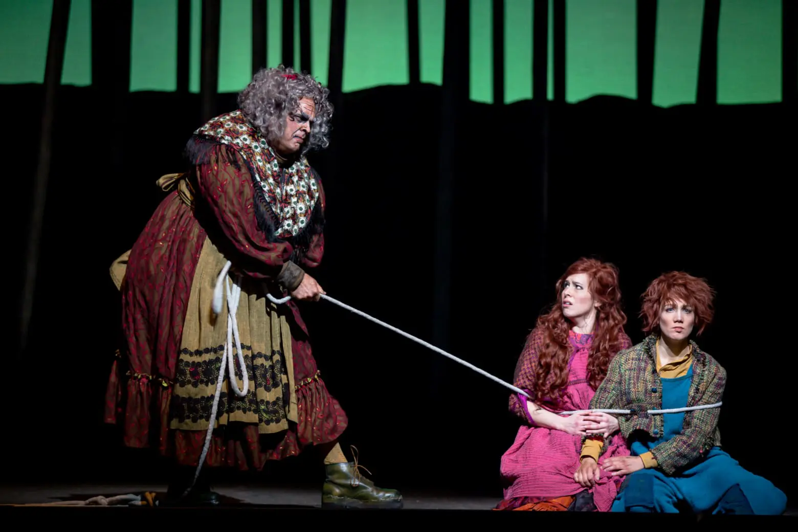 Robert Clark (The Witch) Lida Szkwarek (Gretel) and Andrea Hill (Hansel) in Edmonton Opera’s Hansel and Gretel. Photo: Nanc Price