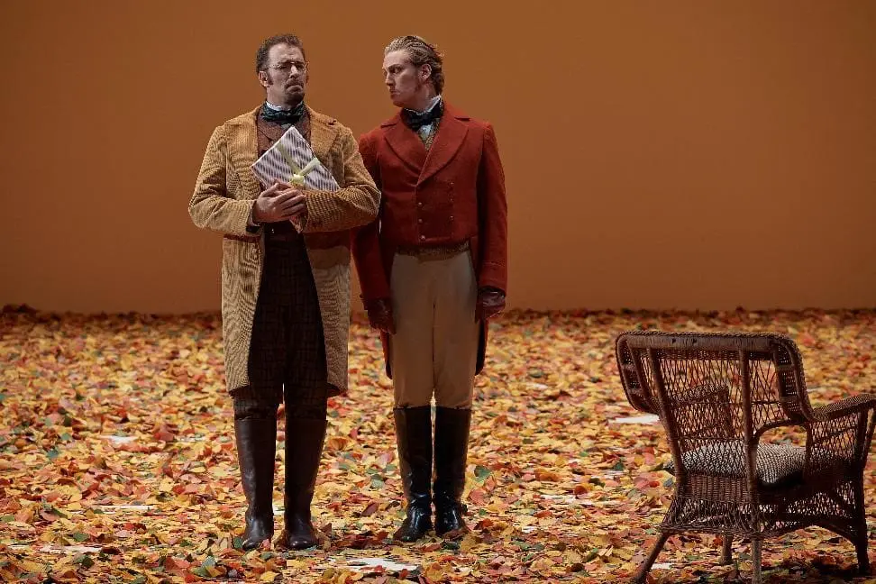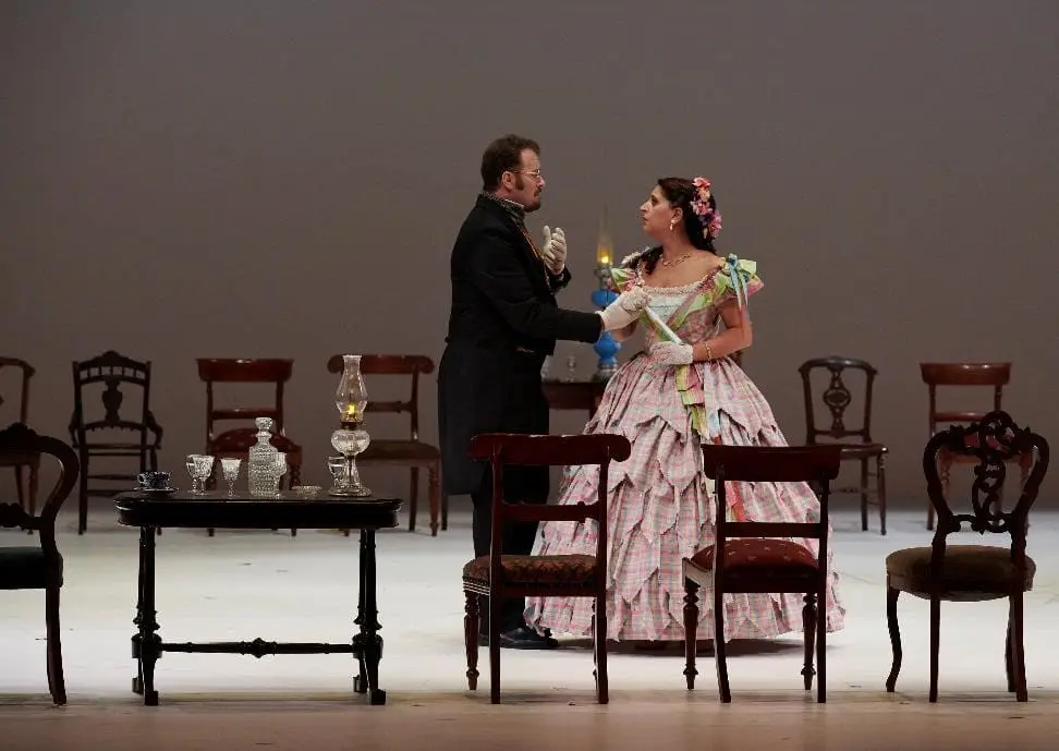 Tatyana’s modest Act II countryside, name-day ball takes place in a small, enclosed square of chairs, filled to the last inch with guests. Women wear dresses with large floral prints and bright colours; Monsieur Triquet and his name-song bizarrerie is what passes for entertainment (in some productions, as Triquet sings, Onegin is laughing from the sidelines; in this one, he can’t even be bothered to react). The killing of Lensky in the duel and the tableau immediately following it during the grand polonaise are ingeniously connected as Onegin’s bewigged footmen come in, clean up the scene, take Lensky’s corpse away and dress the indifferent Onegin for the next ball. Six years have passed. Onegin is still living aimlessly, and still dressing smartly.